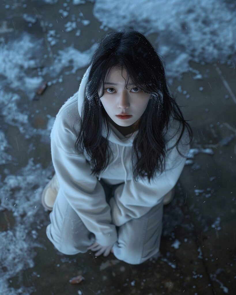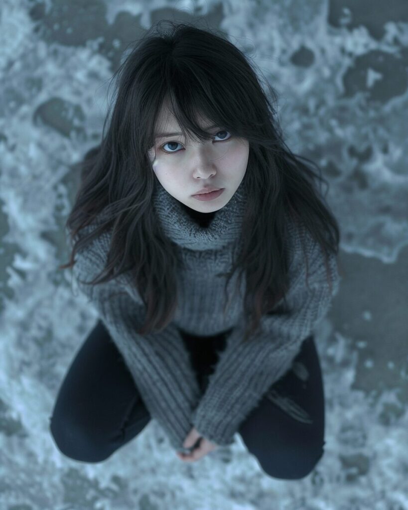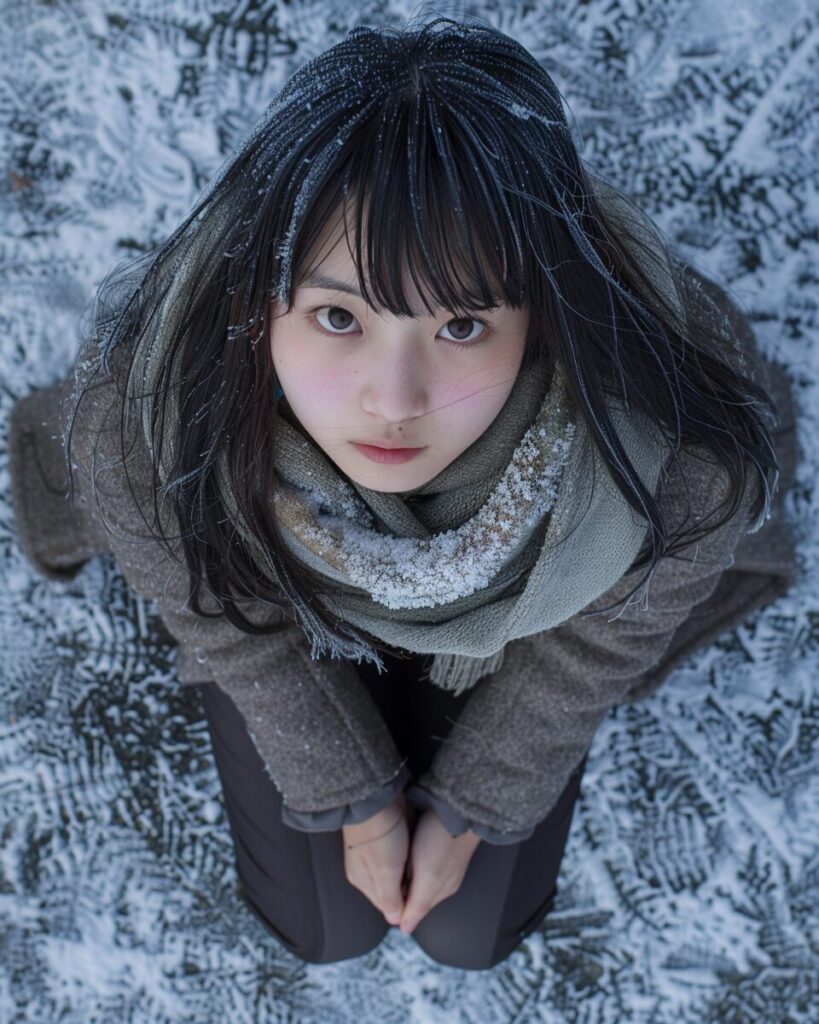 使用したプロンプトはこちら▼ <prompt> Photo, Japanese girl, 🇯🇵, straight hair, sitting, from above, looking at the camera, full body, Nighttime Hoarfrost, --ar 4:5