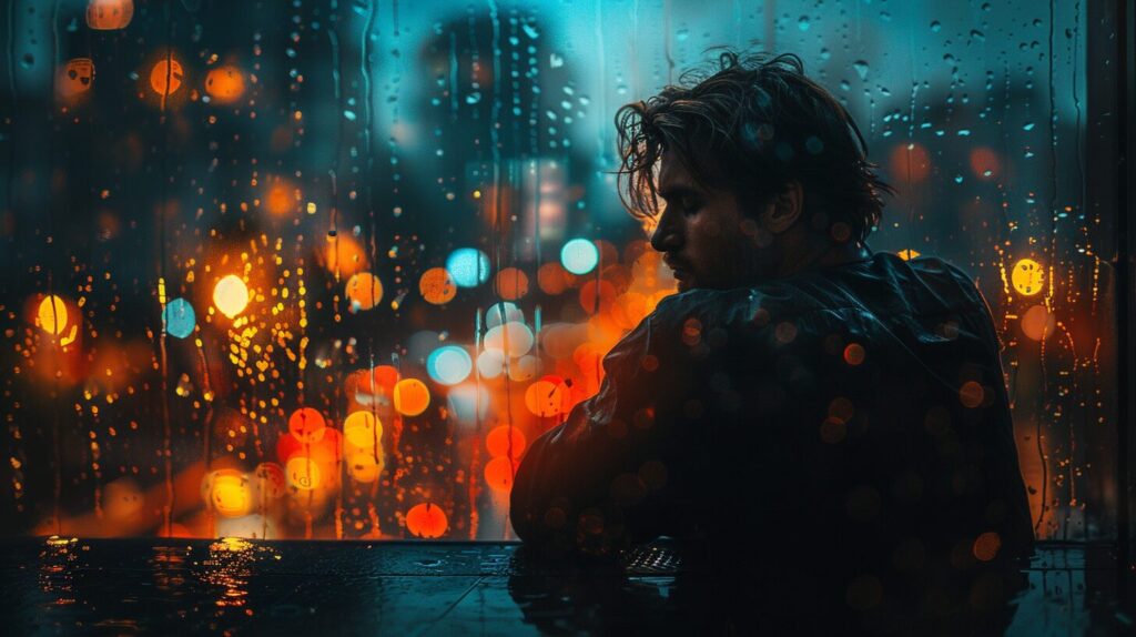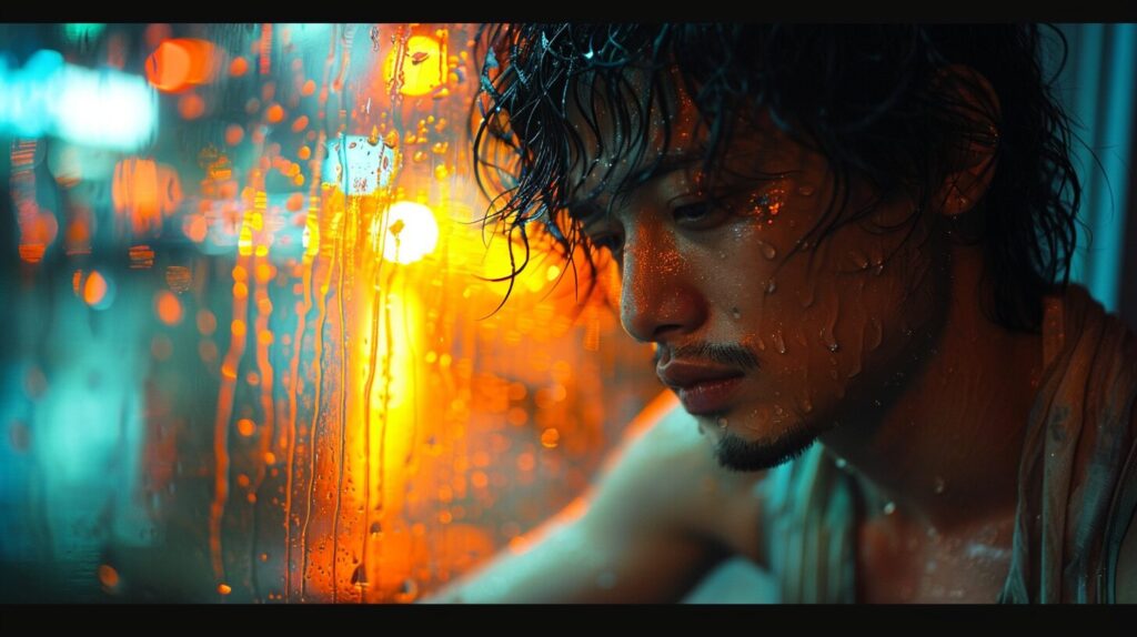 使用したプロンプトはこちら▼ <prompt> young man slight strong handsome elegant gentleman man sitting at the window, head down meditation, eyes lonely, sad, distant lights dim, Wong Kar-wai movie style, --ar 16:9 --stylize 750