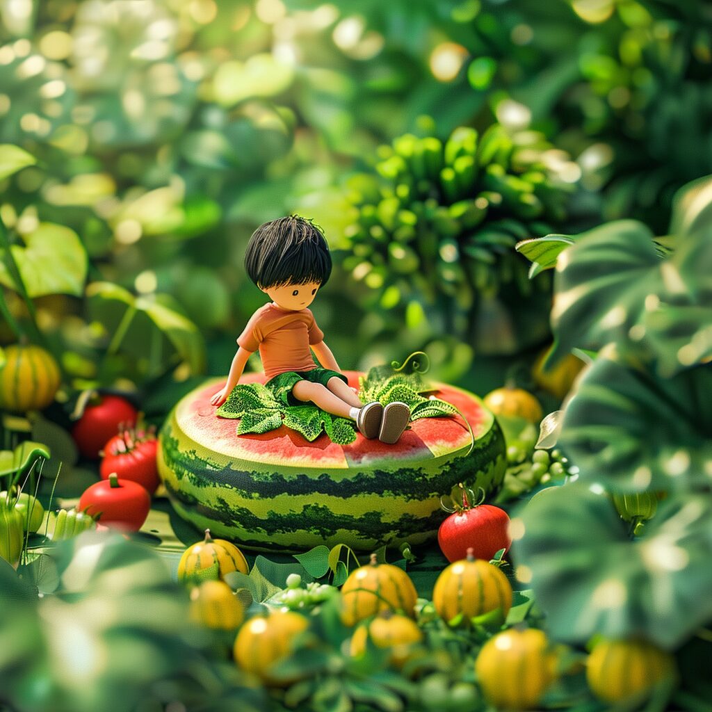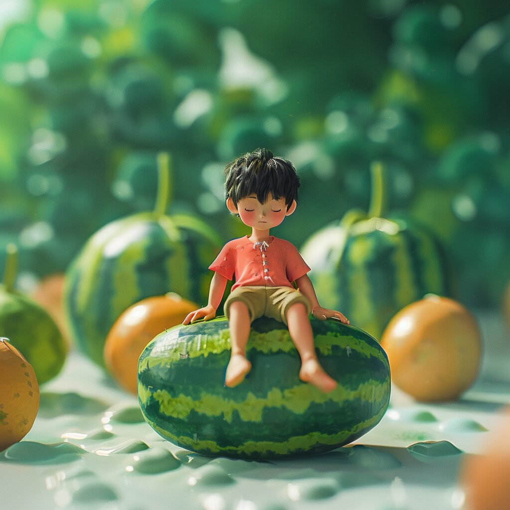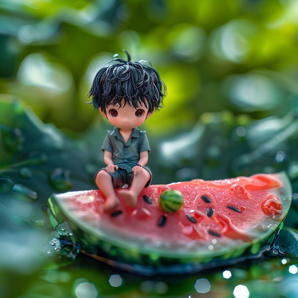 使用したプロンプトはこちら▼ <prompt> Microphotography. A little black hair boy sat on a watermelon , Swinging his legs leisurely . simple composition of the image , tilt - shift , aerial view , cute , cad , OC renderer bright and cheerful , high saturation color , natural light , illustration , surrealism , rich in detail ,8k, large aperture f1.2,8k, depth of field .-- v 5.2-- style raw