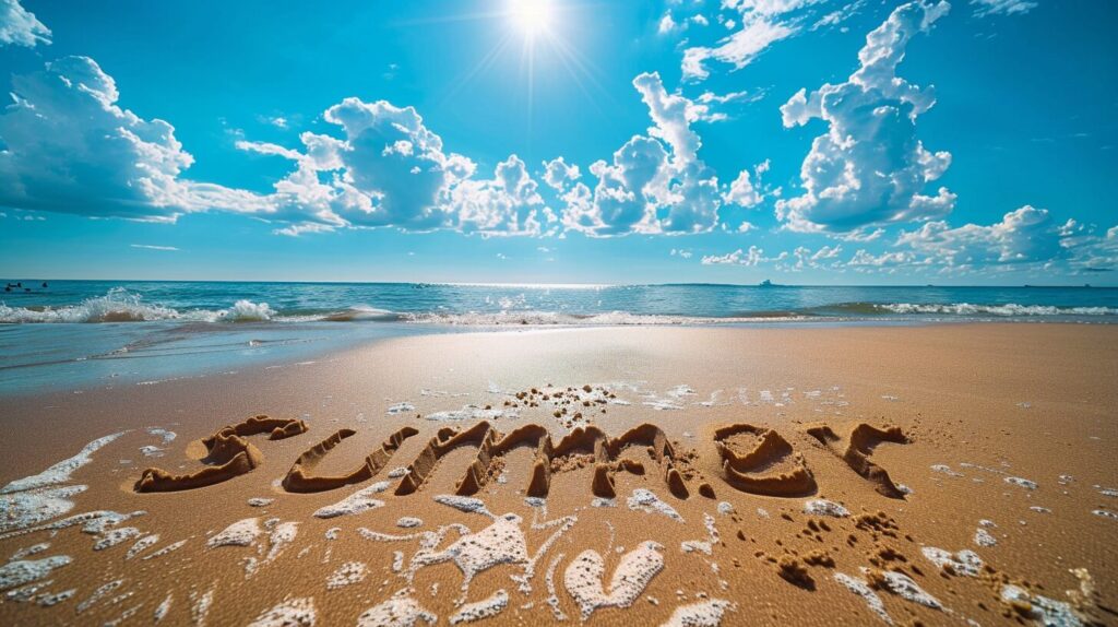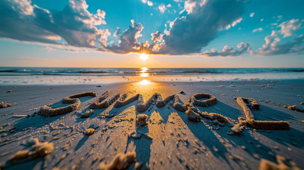使用したプロンプトはこちら▼ <prompt> the words "summer" written on the sand under a blue sky in dark white and light orange colors, --ar 16:9 --stylize 150