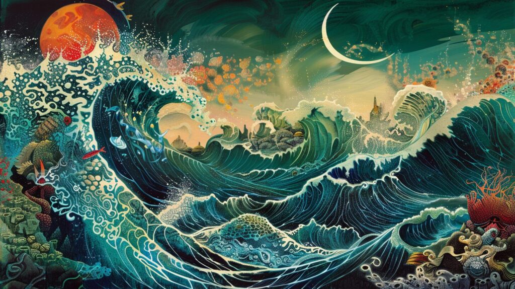 使用したプロンプトはこちら▼ <prompt> A dreamlike ocean scene, merging Eyvind Earle's stylized seascapes with Remedios Varo's surreal elements. Earle's bold, graphic waves and vivid colors form the ocean's expanse, while Varo's mystical sea creatures and enigmatic figures swim beneath the surface, adding a layer of surreal mystery. The result is a vibrant, otherworldly underwater world. Fantasy, surreal seascape, mixed-media --ar 16:9