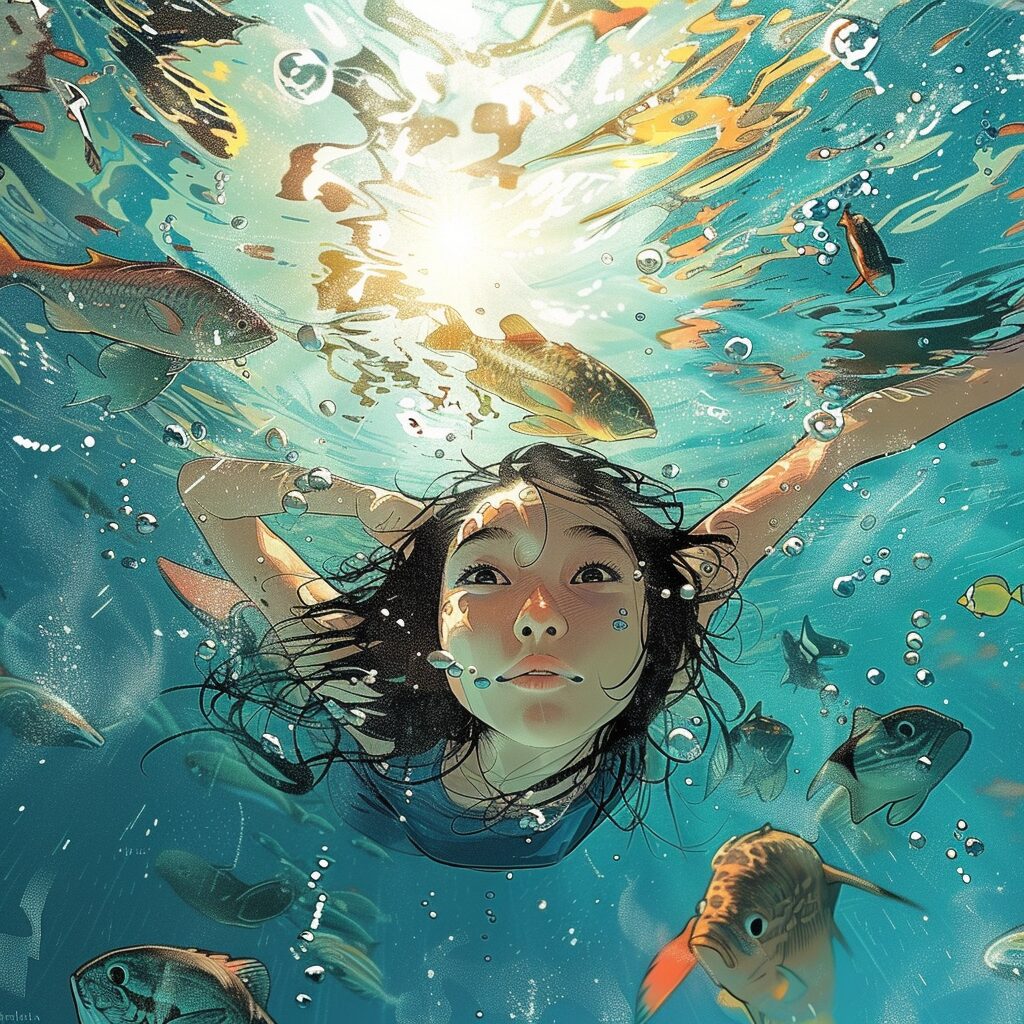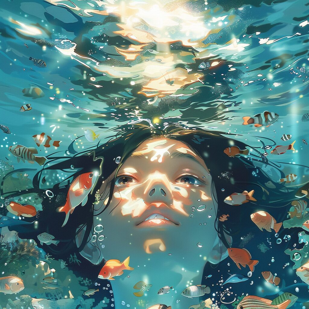 使用したプロンプトはこちら▼ <prompt> view of a woman underwater, a girl surrounded by fish and other sea animals, diving and leaning on the surface, the sun is shining through the water surface, comic art style, woman in ocean, woman swimming, comic art, comic art style, interesting illustration, view of the face and half of the body, illustration like loish art