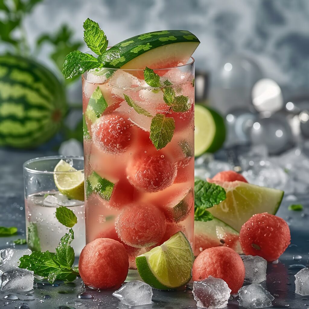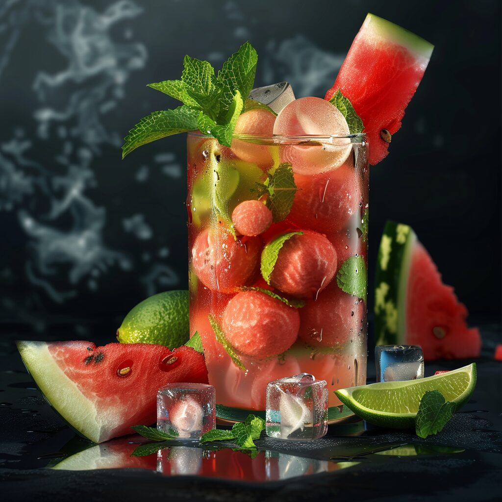 使用したプロンプトはこちら▼ <prompt> Craft an AI-generated image of a watermelon cooler with freshly scooped watermelon balls, lime juice, sparkling water, and ice cubes, garnished with watermelon wedges and mint leaves for a cool and hydrating refreshment, 4k --no wire