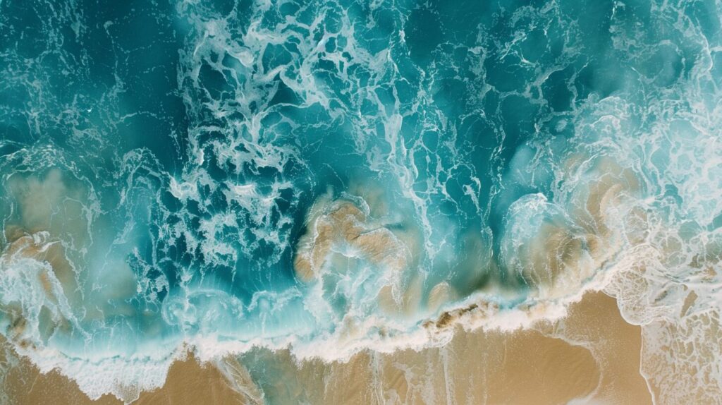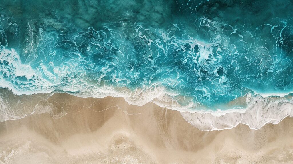 使用したプロンプトはこちら▼ <prompt> an aerial view of the beach and ocean from above by Shigeo Fukuda, in the style of fluid simplicity, beige and aquamarine, , creative commons attribution, narrative-driven visual storytelling, vibrant stage backdrops, teal and white --ar 16:9