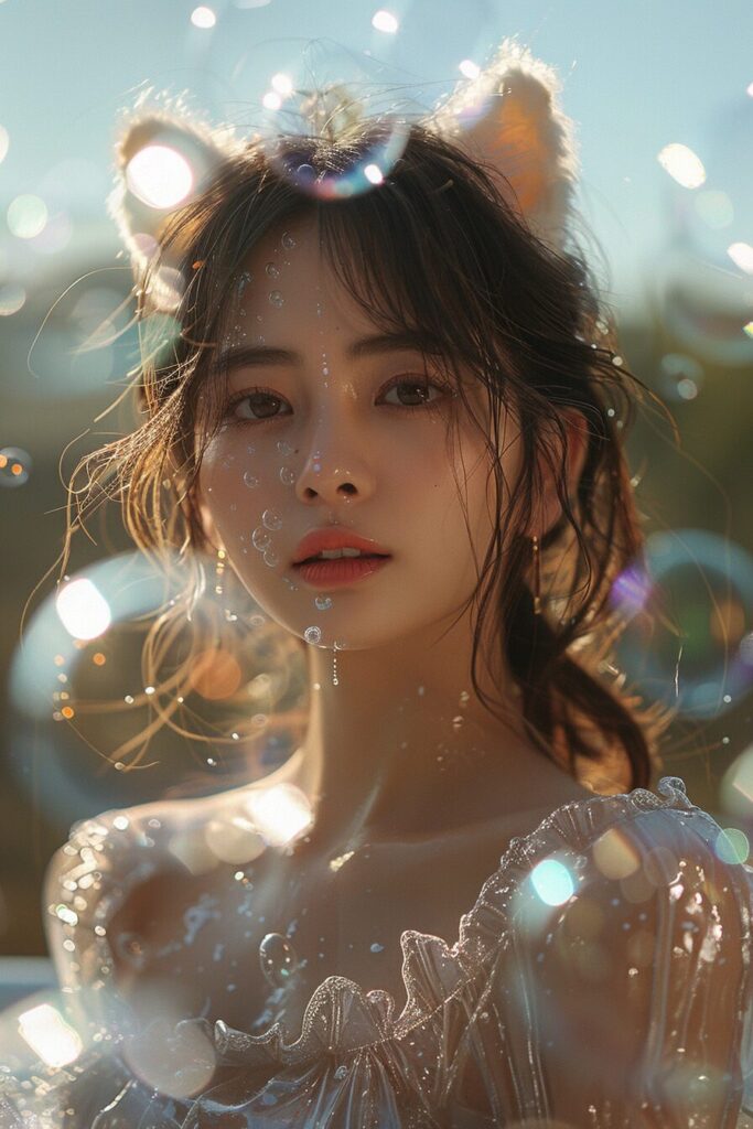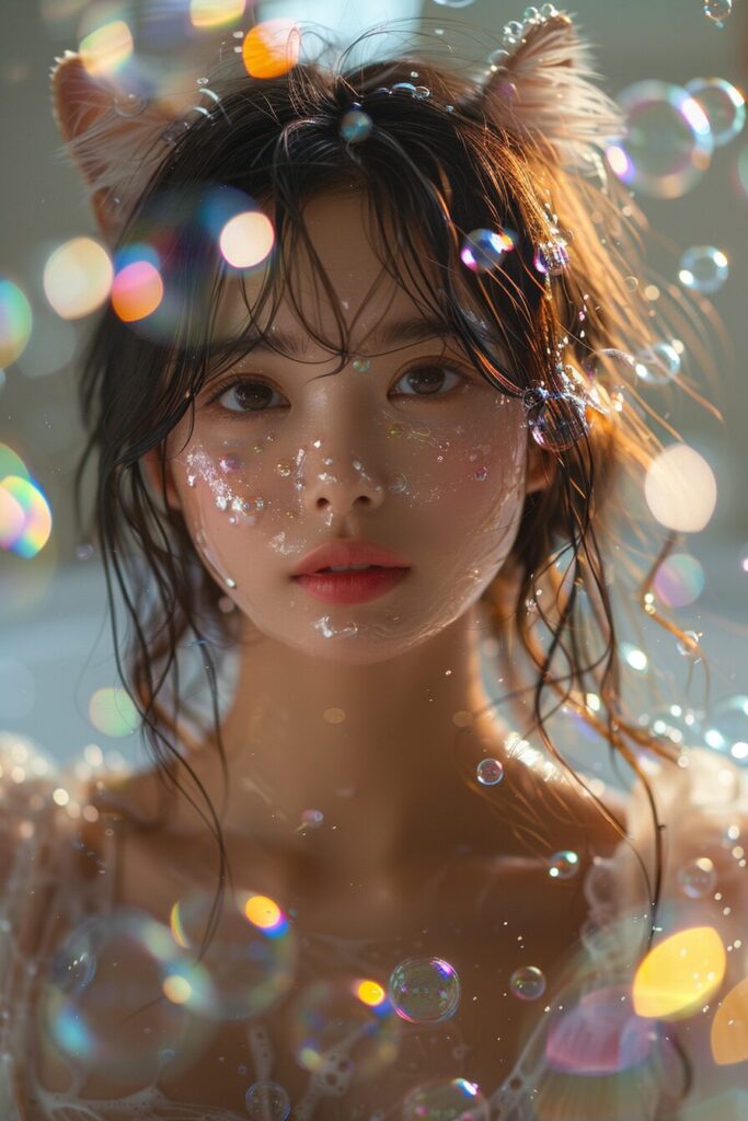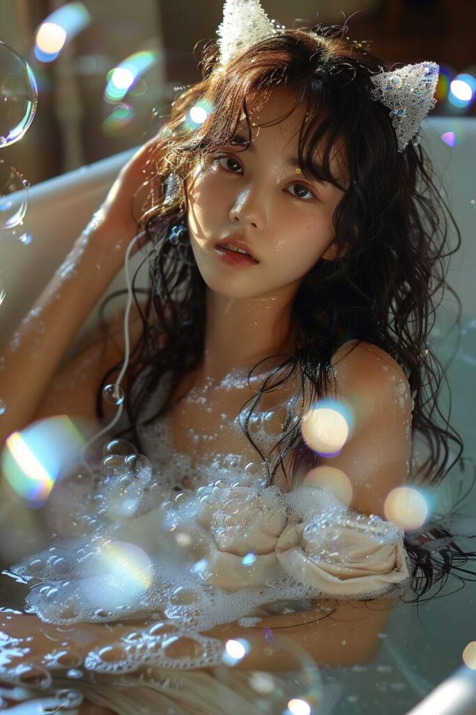 使用したプロンプトはこちら▼ <prompt> A photograph of a radiant Asian girl with cat ears, joyfully posing in a bubble-filled bathtub,arm up surrounded by iridescent soap bubbles, cheerful, light-filled bathroom ambiance. Delicate foam clinging to her skin, reflecting the soft light. Created Using: high-resolution photography, soft light effects, playful bubble textures, delicate foam details, cheerful expression, hd quality, natural look --ar 2:3 --stylize 750