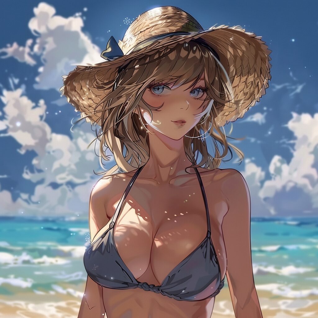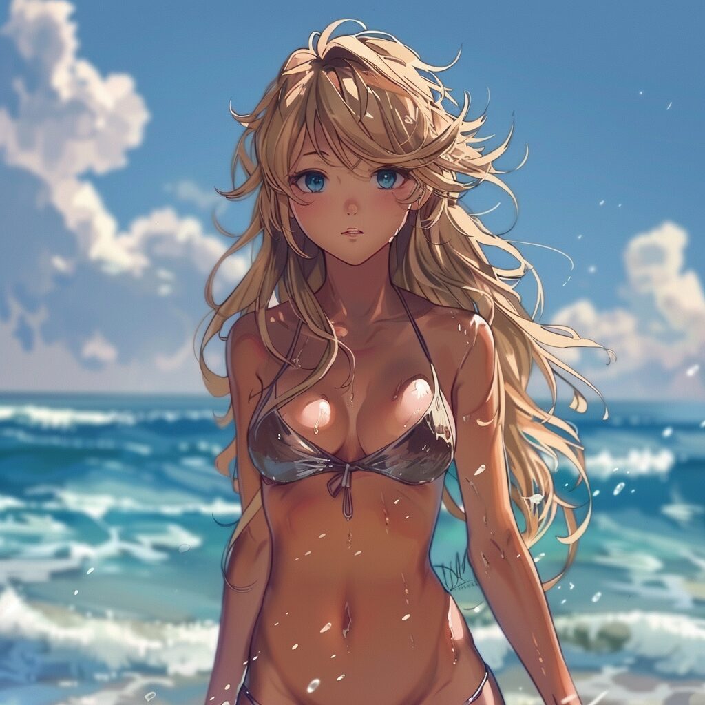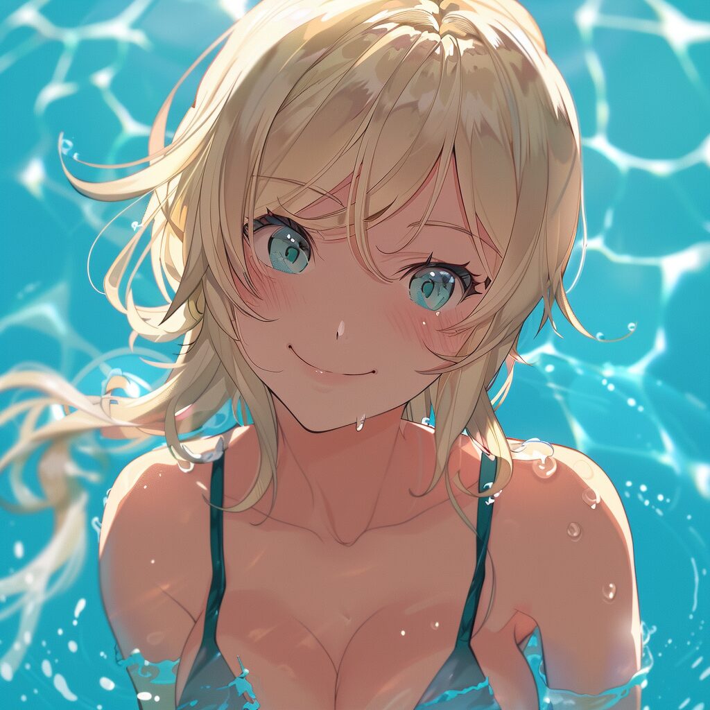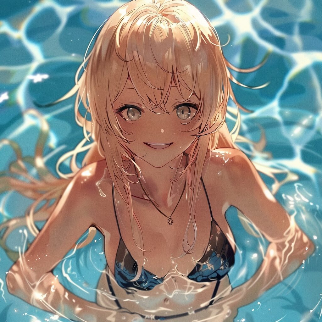 使用したプロンプトはこちら▼ <prompt> cute anime smiling blonde girl at the pool