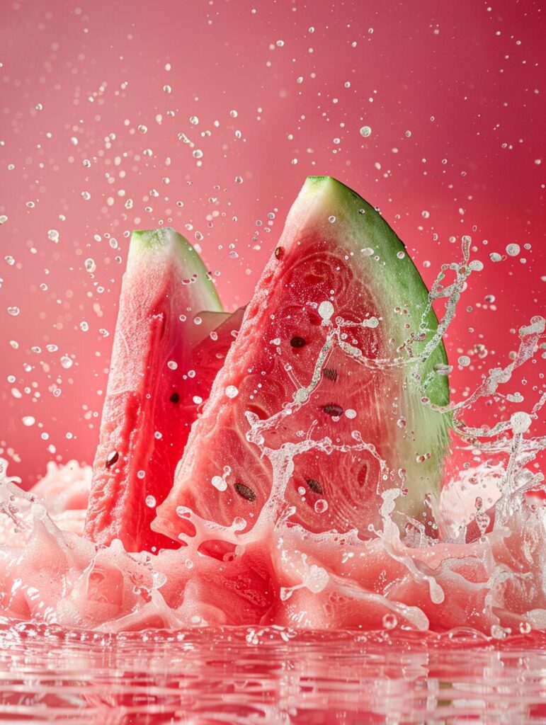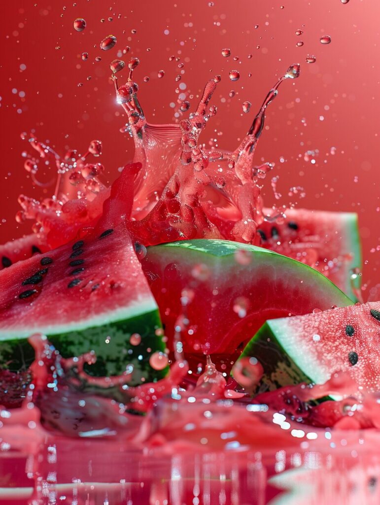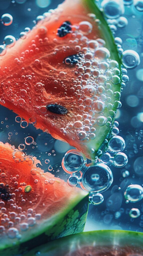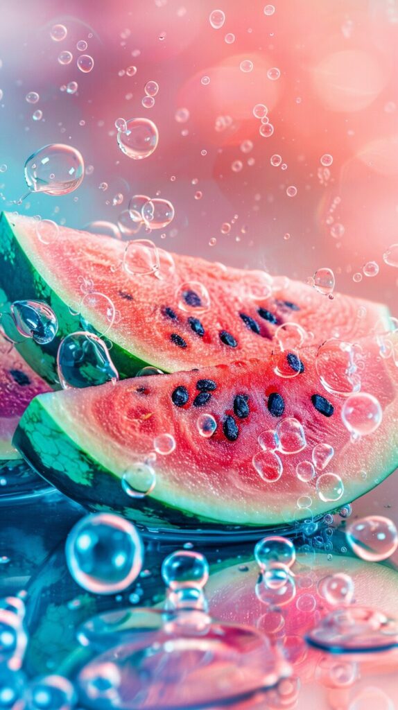 使用したプロンプトはこちら▼ <prompt> Sliced fresh watermelon with bubbles on water, in the style of flowerpunk, soft and dreamy depictions, kimoicore, gemstone, felicia simion, 32k uhd, organic designs --ar 9:16