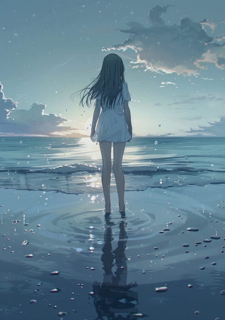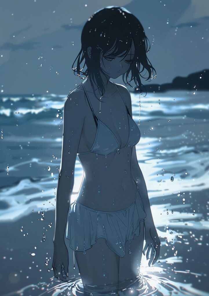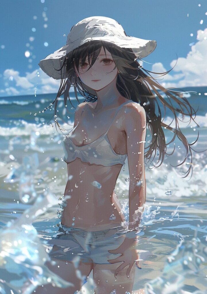 使用したプロンプトはこちら▼ <prompt> a cute girl standing in the water on the beach in summer, in the style of nightcore, light navy and light gray, blink-and-you-miss-it detail, fragmented memories, water drops, ocean academia, heavy shading --ar 45:64
