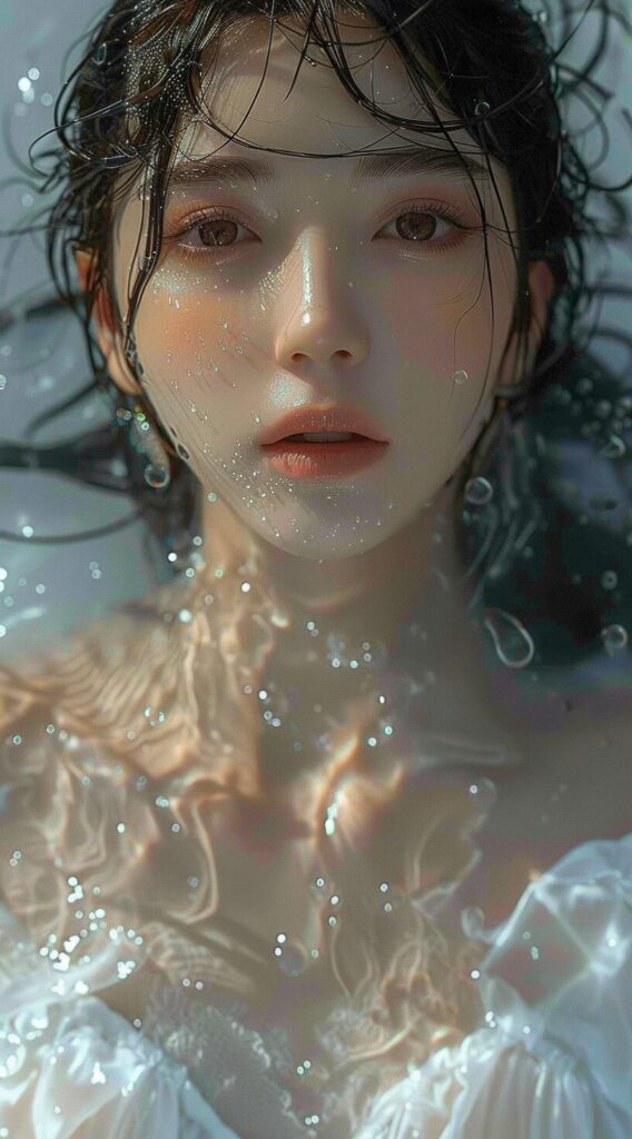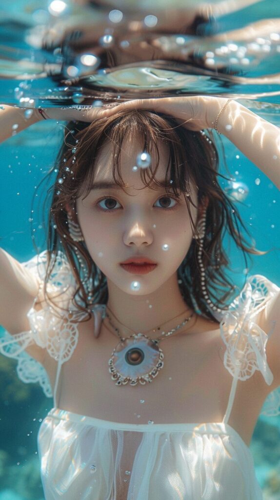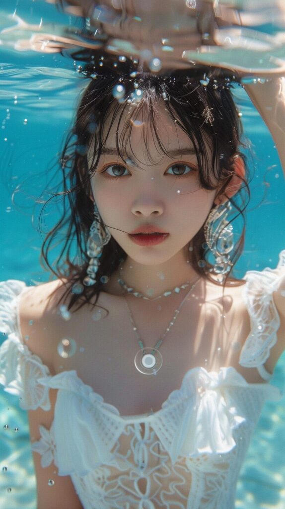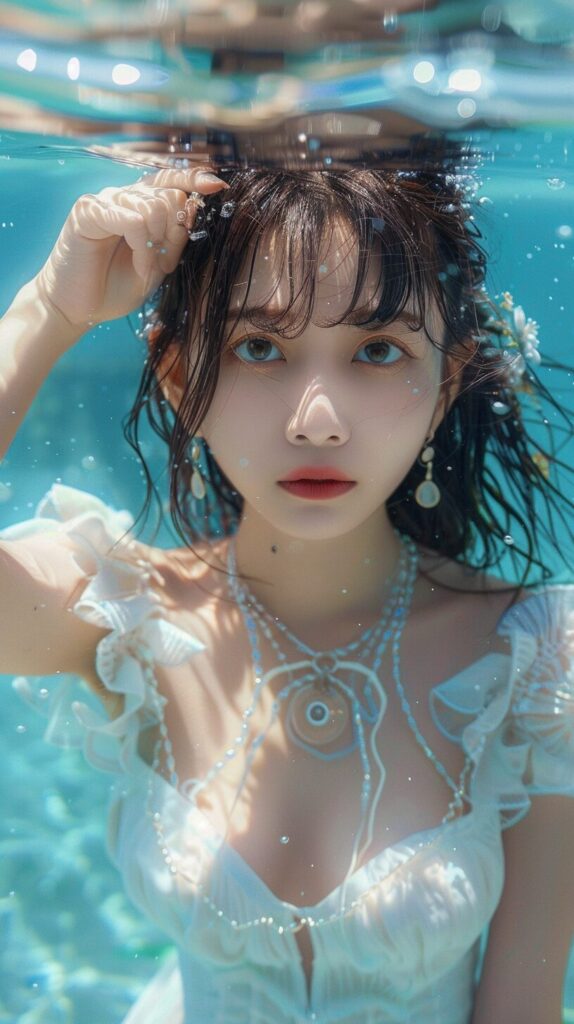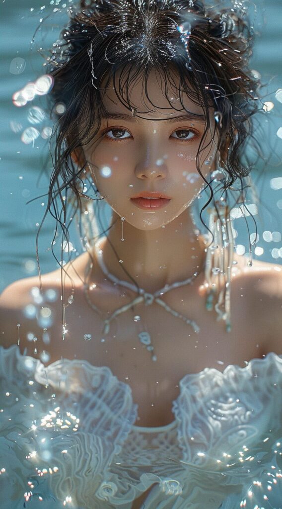 使用したプロンプトはこちら▼ <prompt> the young girl in the white dress is immersed in water, in the style of the stars art group (xing xing), detailed facial features, light aquamarine, uhd image, gongbi, detailed character design, photo-realistic --ar 71:128 --stylize 750