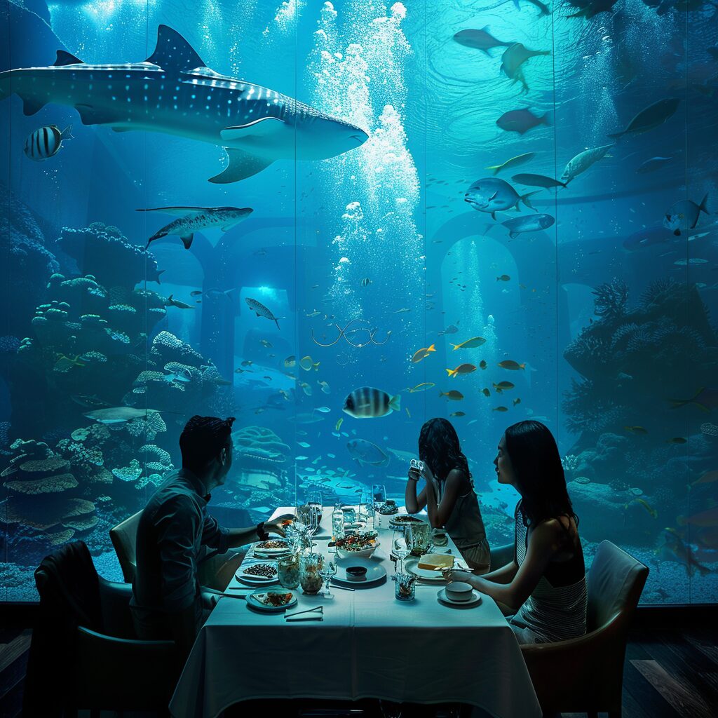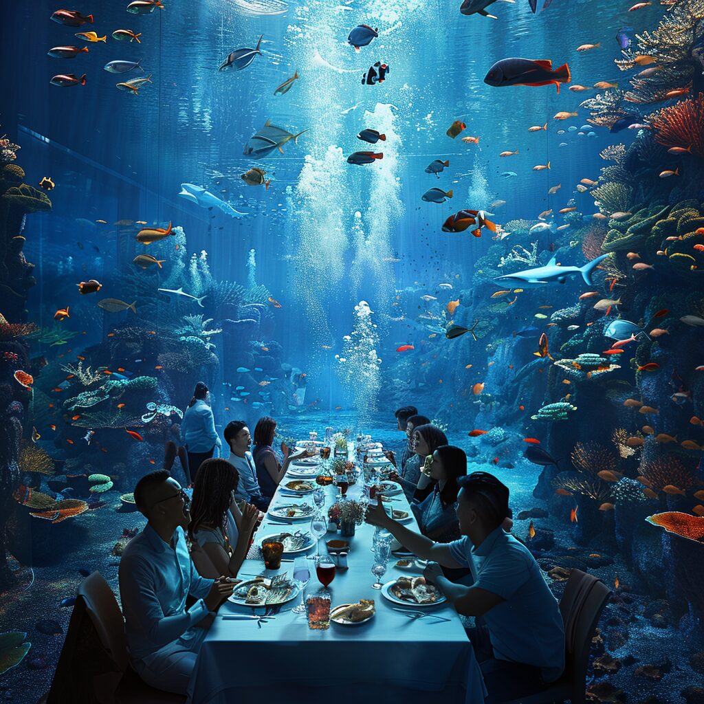 使用したプロンプトはこちら▼ <prompt> people having dinner casually while their table is inside a huge aquarium where fish and divers swim past, photorealistic