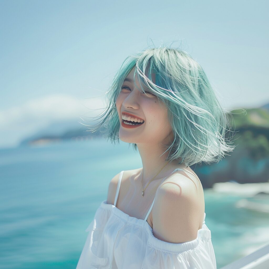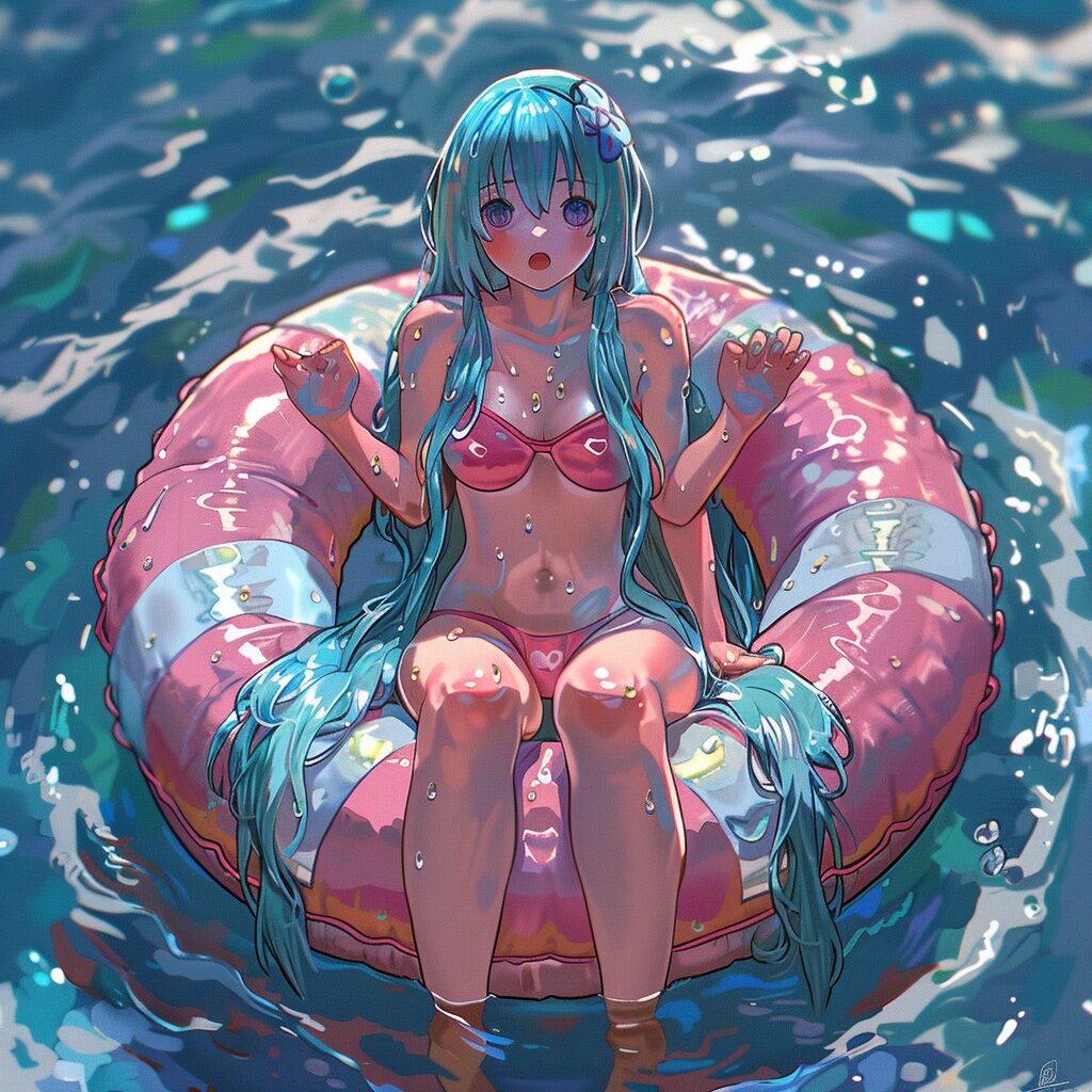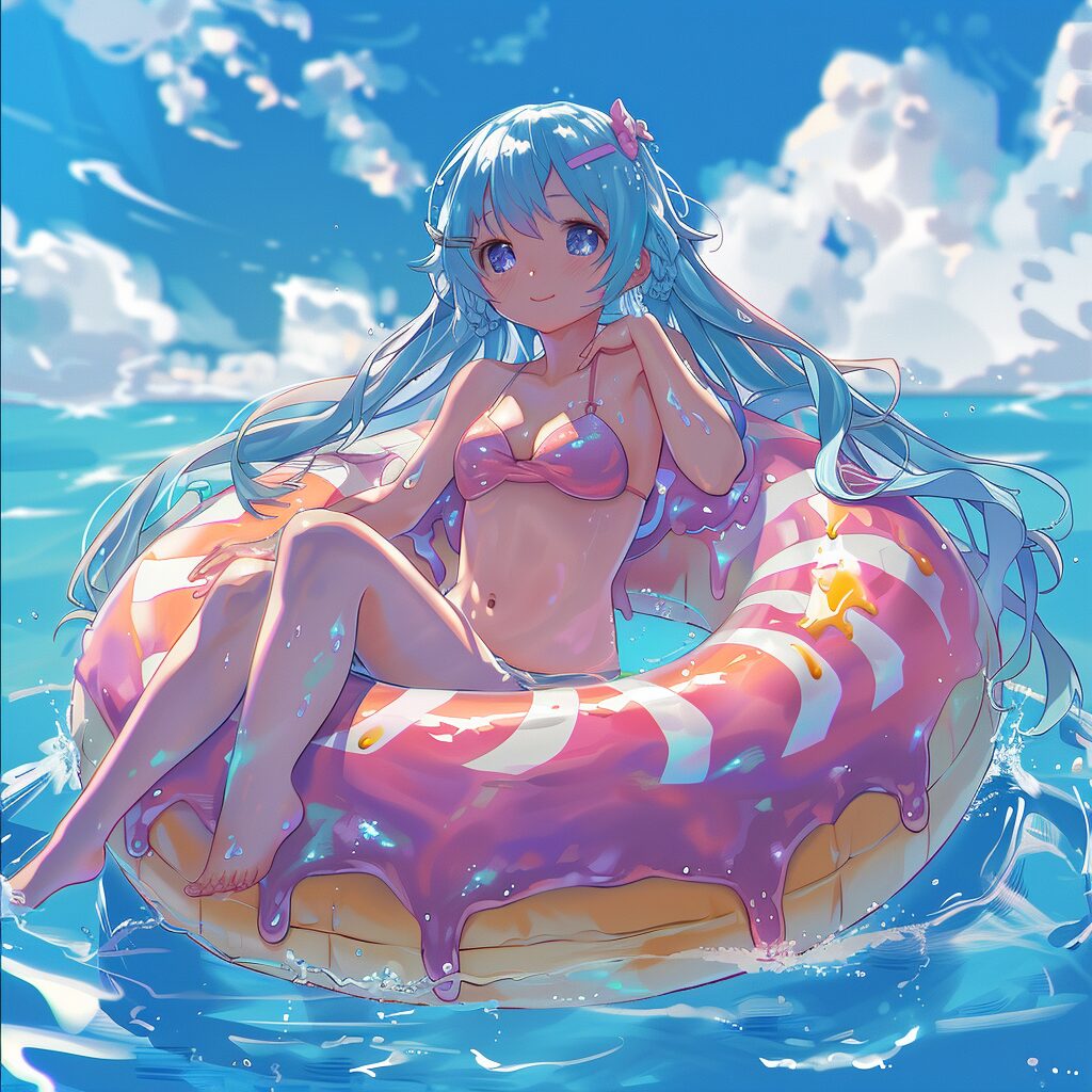 使用したプロンプトはこちら▼ <prompt> Create a realistic anime-style image of a girl sitting in a donut-shaped floatie. The floatie should have vibrant pink and white stripes, evoking a playful and cute appearance. The girl has long, blue hair and large, sparkling eyes, embodying the quintessential anime character aesthetics. She is depicted enjoying a sunny day in the water, with a joyful expression on her face, reflecting the light-hearted and carefree moment. The background should hint at a clear blue sky and the glistening surface of the water, enhancing the overall summer vibe. Ensure the image is colored to bring out the vividness and charm of this scene.
