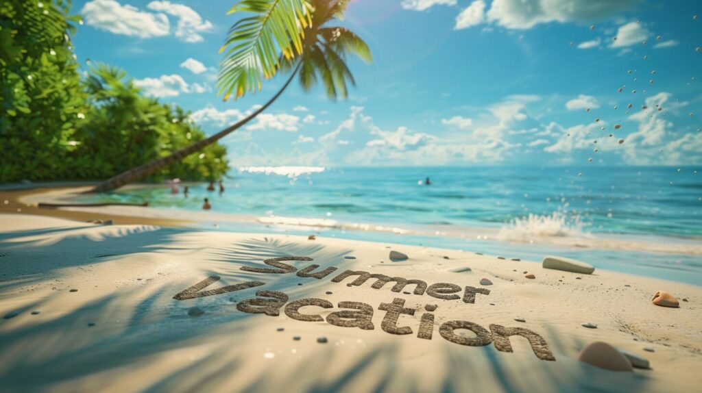 使用したプロンプトはこちら▼ <prompt> a realistic photo of а beach scene with the words "Summer Vacation" written in the sand, against the backdrop of a seashore with golden sand and green palm trees, ultra realism, 16K --ar 16:9