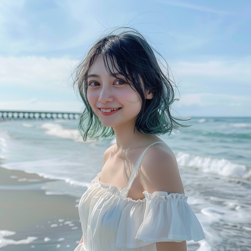使用したプロンプトはこちら▼ <prompt> japanese girl, gray-green short hair, 18 years old, smile, student, seaside, white dress, shimada eimi, half-length shot