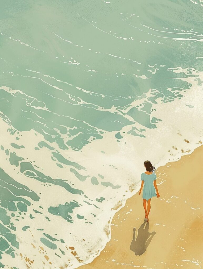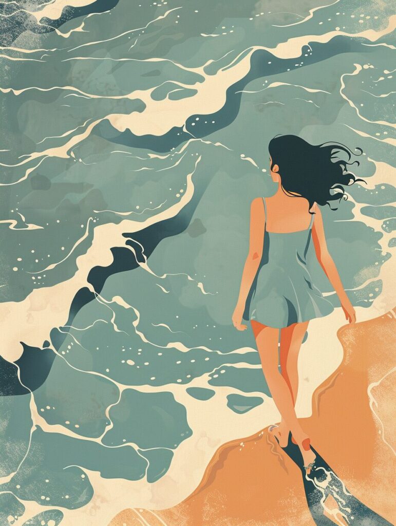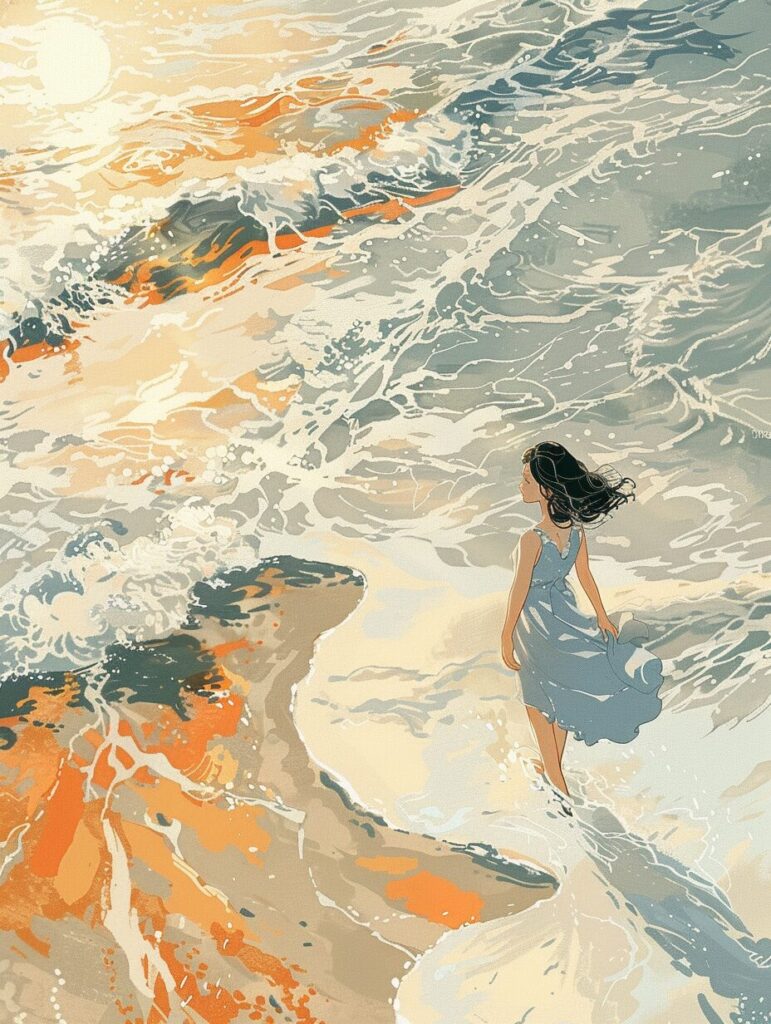 使用したプロンプトはこちら▼ <prompt> beautiful elegant lady in simple blue one-piece dress, walking along the edge of the surf, detailed and layered depiction of waves, reflective sun and cloud on the water surface, in the style of shige's visual aesthetic, diagonal shot from above, minimalist art, highly detailed, high contrast, limited colors palette, light beige and orange, silver and black, superflat, 2d cartoon, clean and sharp inking, perfect shading, slumped/dumped, contrasting backgrounds, chaotic academia, aquarellist, 32k uhd --ar 3:4 --stylize 180