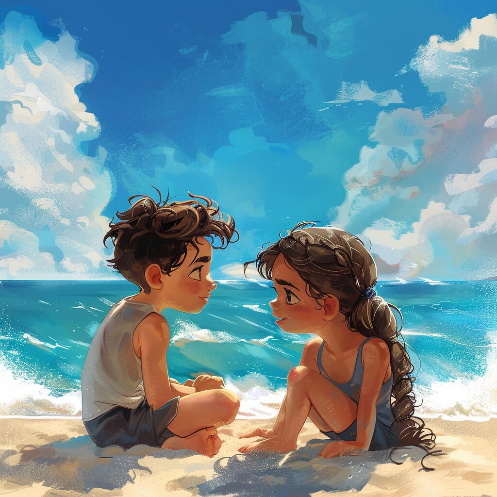 使用したプロンプトはこちら▼ <prompt> A boy and a girl are sitting on the beach
