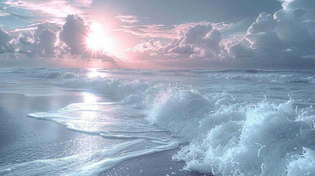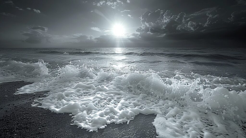 使用したプロンプトはこちら▼ <prompt> photonegative refractograph infrared photography of a sunrise over a tranquil sea, fractal waves gently lapping the shore --ar 16:9 --stylize 250