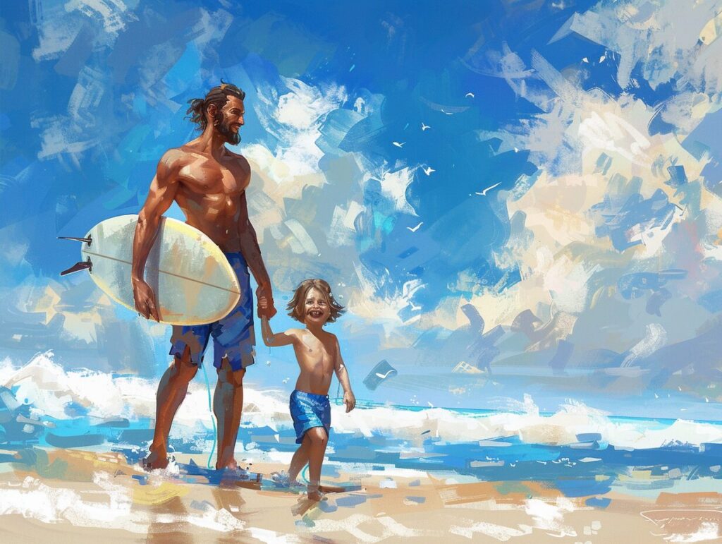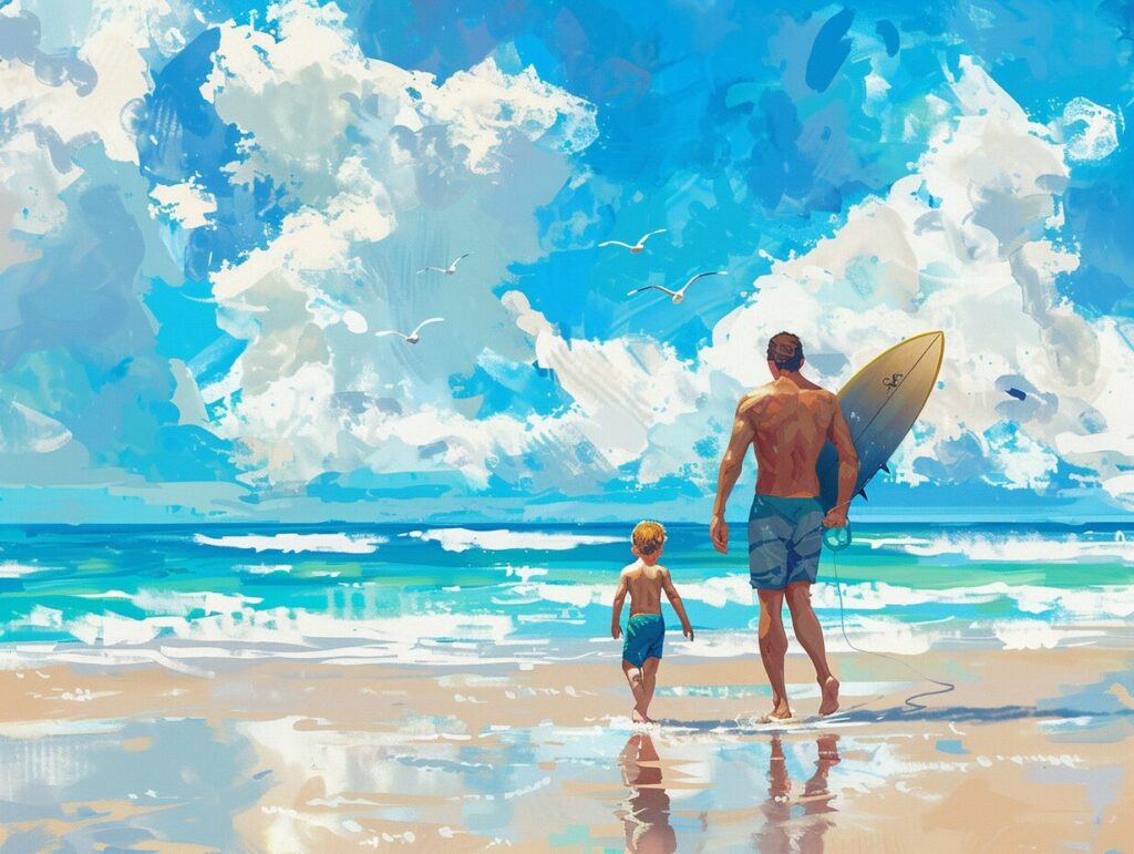 使用したプロンプトはこちら▼ <prompt> The artistic style of anime, on the beach, dad takes his son to walk towards the sea, dad holds a surfboard, the child is laughing, dad and the child are wearing blue fashionable swim trunks --ar 4:3