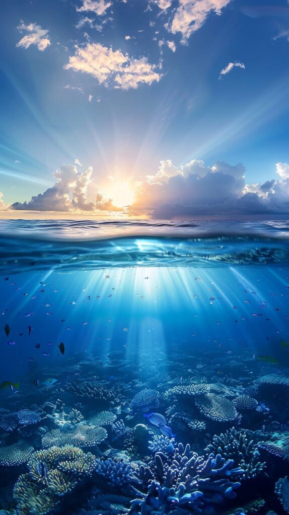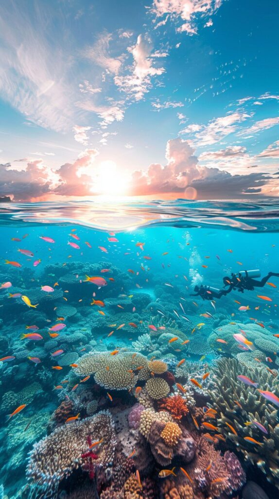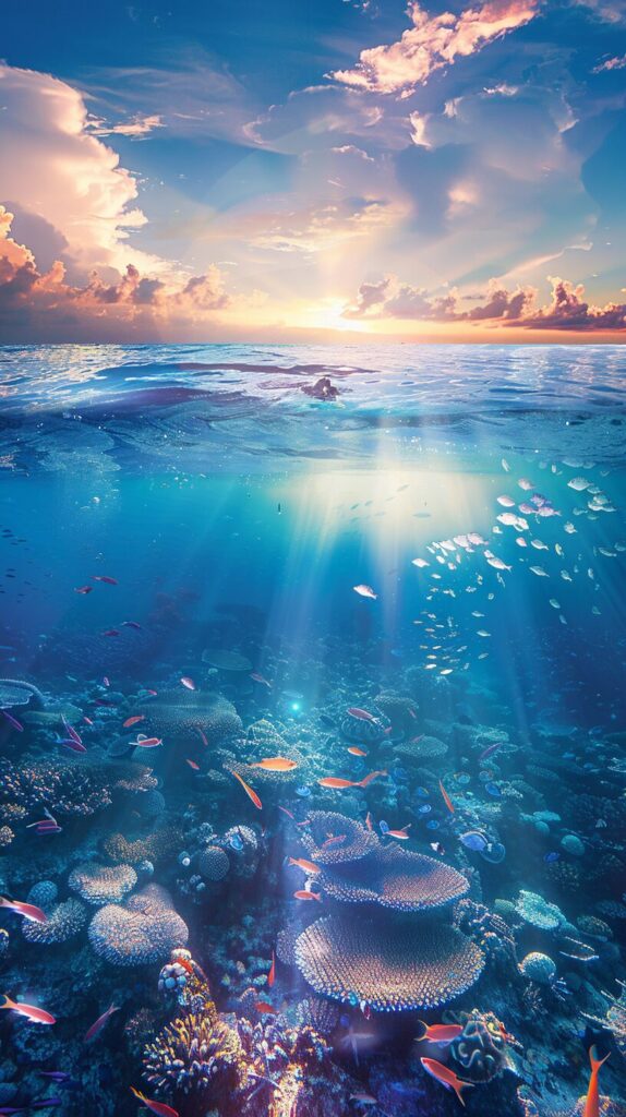 使用したプロンプトはこちら▼ <prompt> Split View of people diving into the ocean, thousands of multi species tropical fish, deep blue ocean extending deep into the horizon, blue clouds reflecting off the water, sunlight piercing through the water --ar 9:16 --personalize 5msfkwp