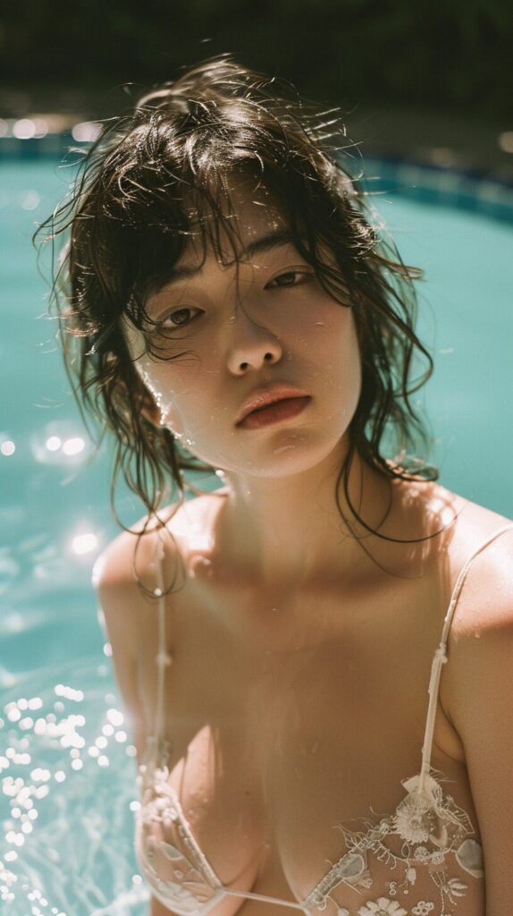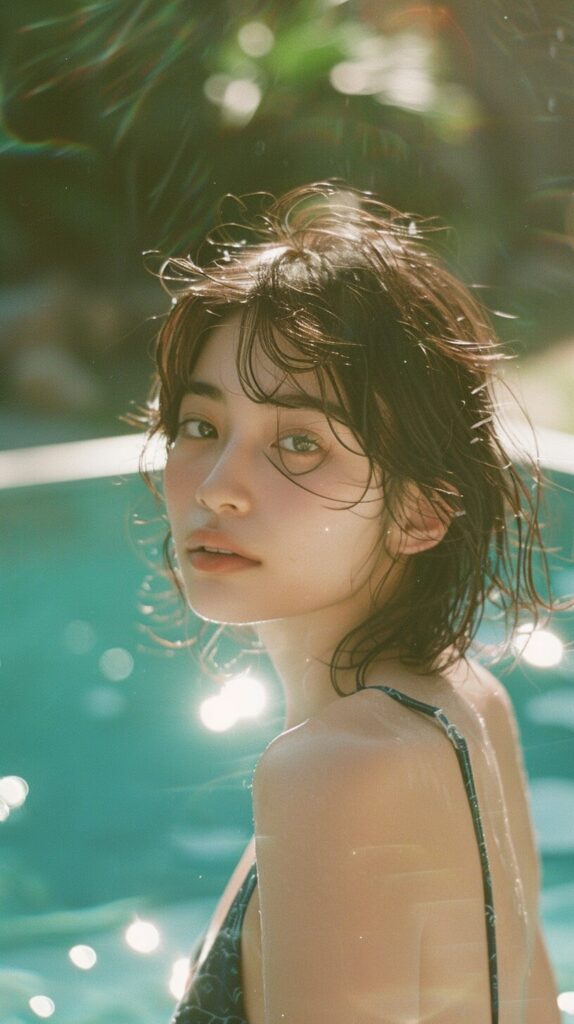 使用したプロンプトはこちら▼ <prompt> film photography of a 17 year old beautiful Japanese girl is standing at the side of pool, close shot, radiance around highlights, shot on fujifilm disposable camera --ar 9:16 --style raw
