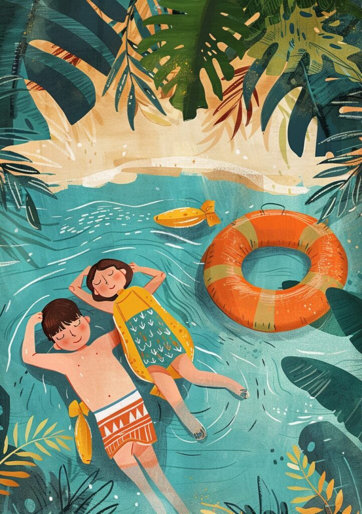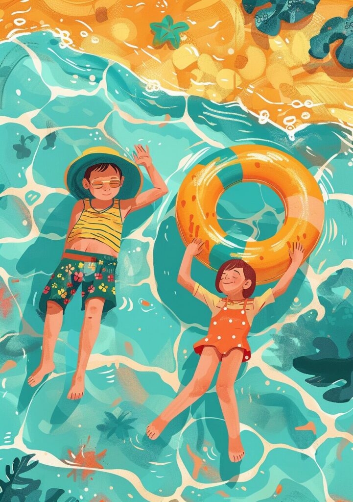 使用したプロンプトはこちら▼ <prompt> two children are lying on the shore of the pool with an inflatable raft, in the style of folk art-inspired illustrations, subtle use of shading, quirky portraits, children's book illustrations, woven color planes, light orange and teal, ultrafine detail --ar 102:145