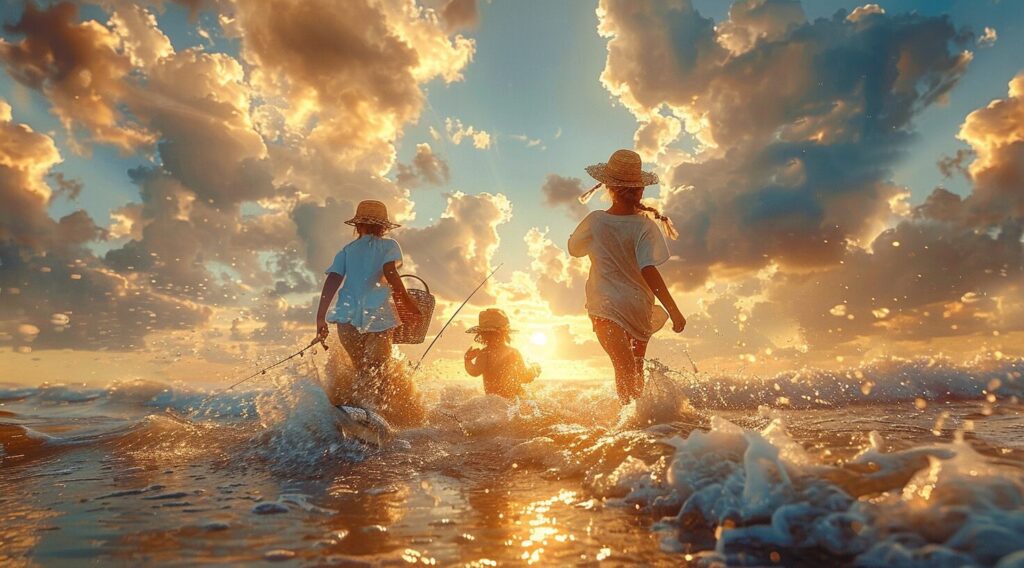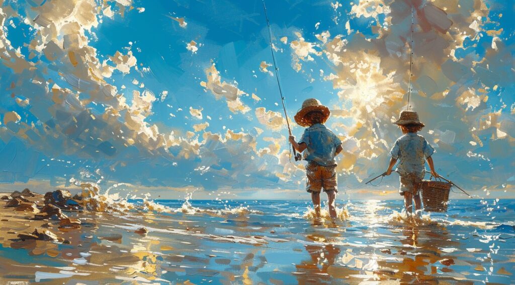 使用したプロンプトはこちら▼ <prompt> Two children, a boy and girl in light blue shirts with straw hats, running on the beach holding fishing rods and carrying a fish basket and suit case, with a sea background and the sun shining through clouds --ar 128:71 --stylize 750