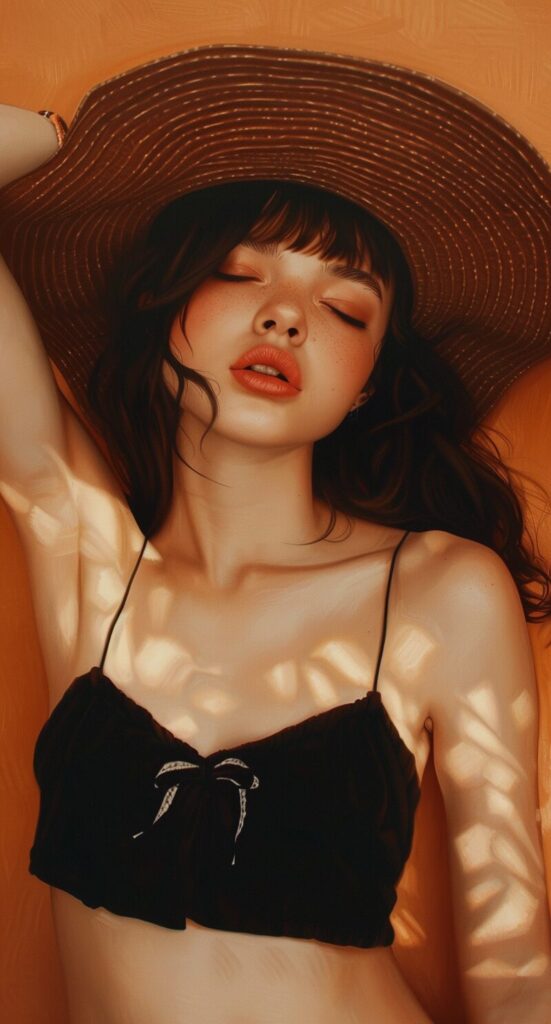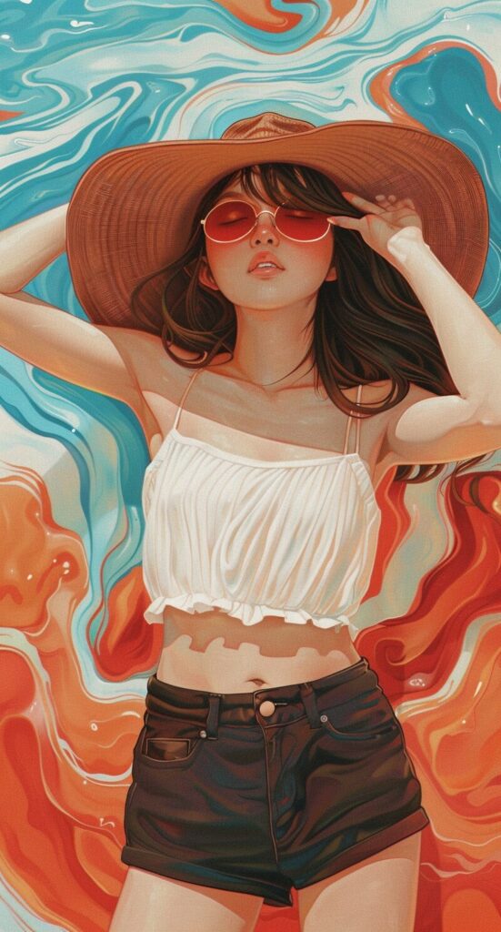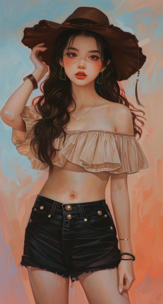 使用したプロンプトはこちら▼ <prompt> the girl is wearing a big brown hat and is wearing black shorts of high quality, in the style of gongbi, light sky-blue and dark red, wavy resin sheets, light white and dark orange, exaggerated facial features, soft and dreamy tones, monochromatic harmony, by Jenny Frison --ar 29:54
