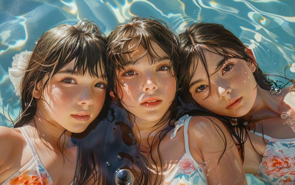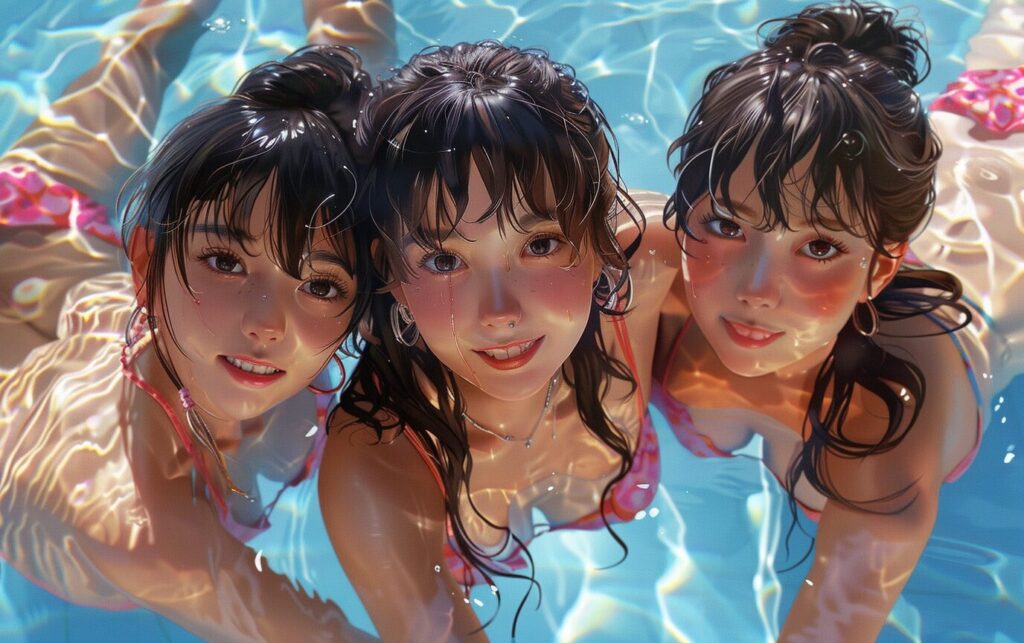 使用したプロンプトはこちら▼ <prompt> three young girls, anime, hyper realistic, photorealism, best friends, pool, I can't believe how beautiful this is, --ar 8:5 --style raw