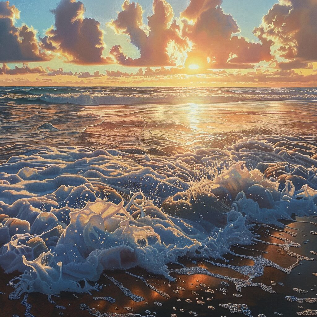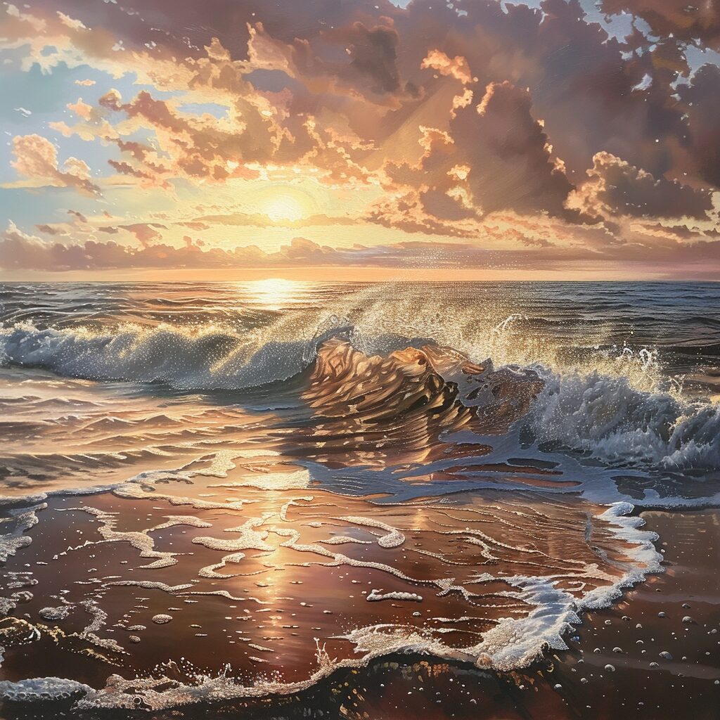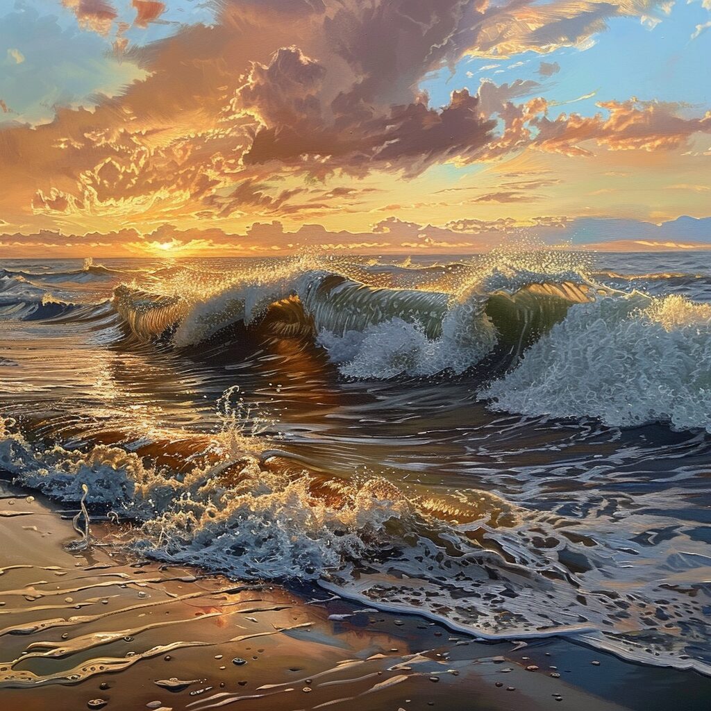 使用したプロンプトはこちら▼ <prompt> hyper realistic oil painting of waves crashing on a beach at sunset, no edge, no border