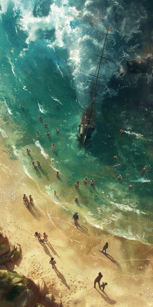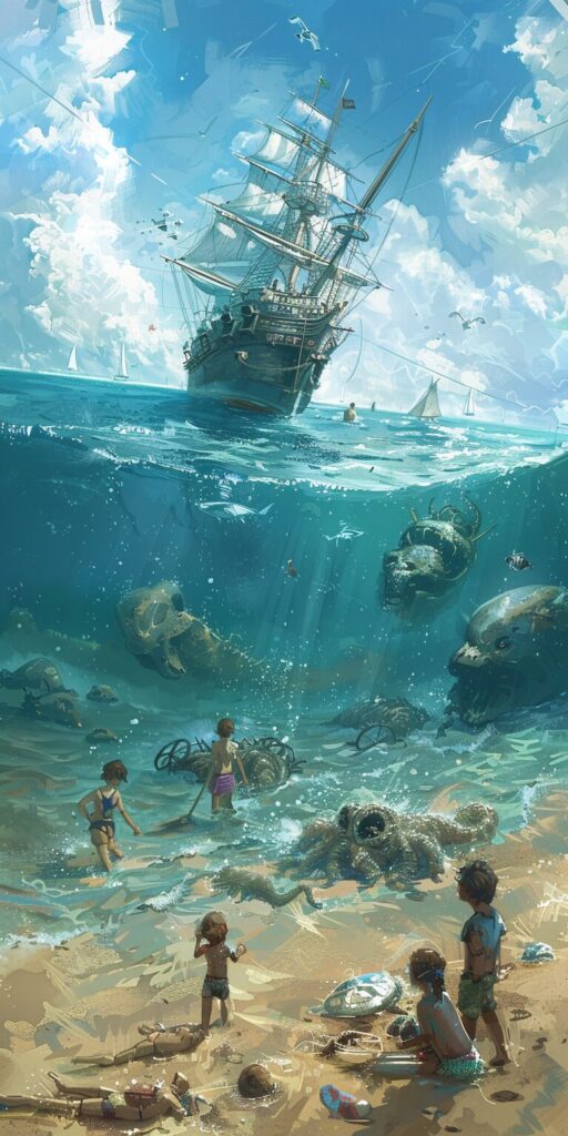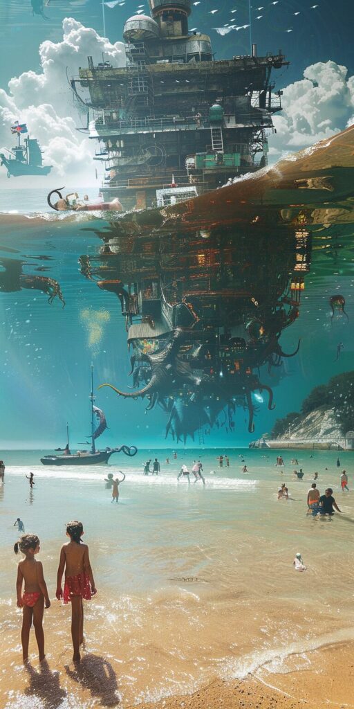 使用したプロンプトはこちら▼ <prompt> A bright beach day, with families playing in the sand and swimming in the sea. On the edge of the image, half-submerged in the water, lies a mysterious, metallic object that seems out of place in this idyllic scene. As the view extends upwards, the scene transitions to a darker, more ominous sea. Perhaps a ghostly pirate ship looms in the distance, or giant tentacles emerge from the deep, adding a sense of foreboding and mystery to the otherwise cheerful setting --ar 1:2
