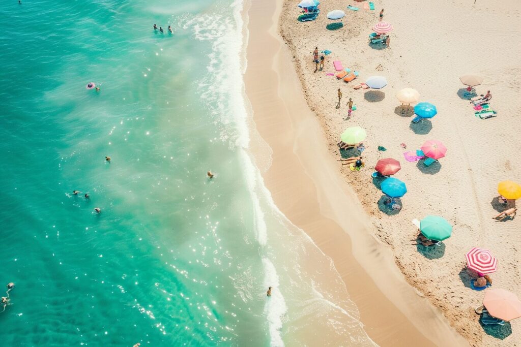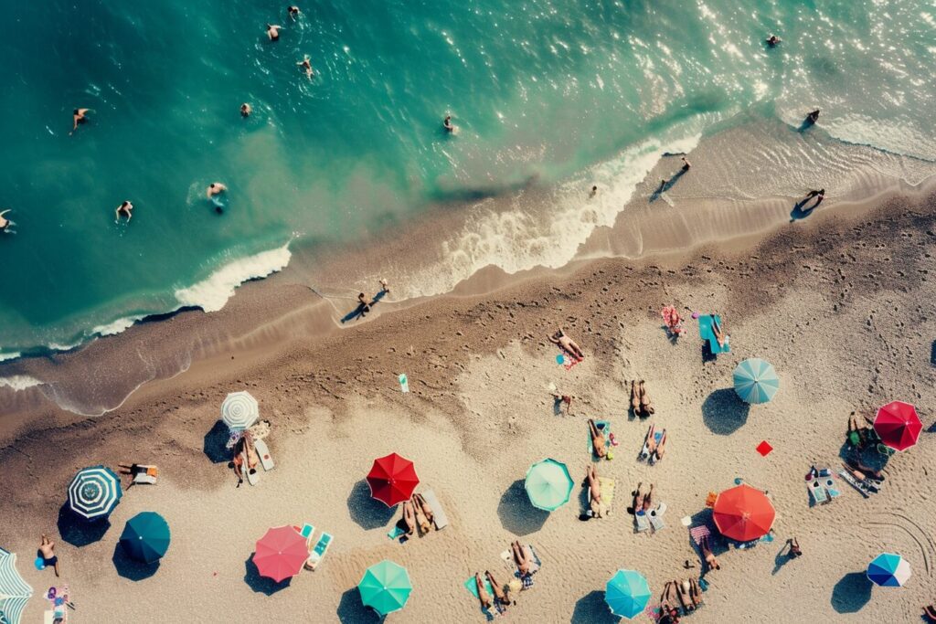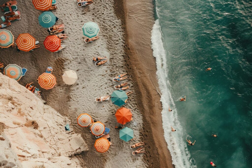 使用したプロンプトはこちら▼ <prompt> aerial view of a beach with people, umbrellas, retro vibe, --ar 3:2 --style raw --stylize 50