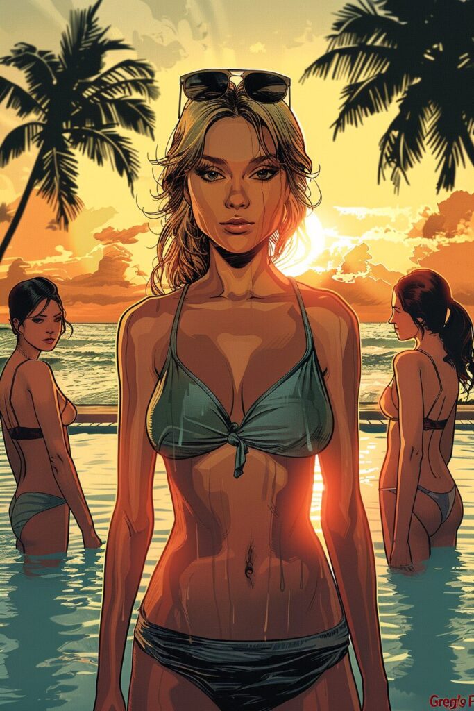 使用したプロンプトはこちら▼ <prompt> high res glamour photo. Nami and robin from one piece on white sand Beach. Sun light, photoshoot, close up body portrait. Pouring water --chaos 20 --ar 3:4 --stylize 1000