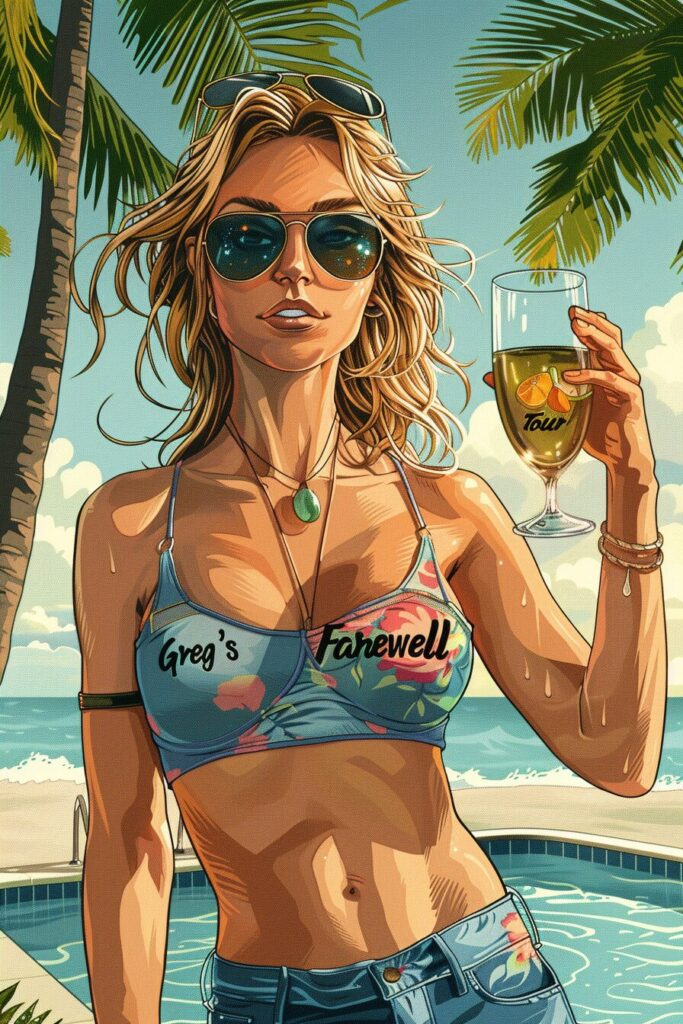 使用したプロンプトはこちら▼ <prompt> create tshirt design, contains the words "Greg's Farewell Tour" in massive font size,pool party in Miami,beautiful women in swimsuits,yacht,alcohol, --ar 2:3 --style raw --stylize 750