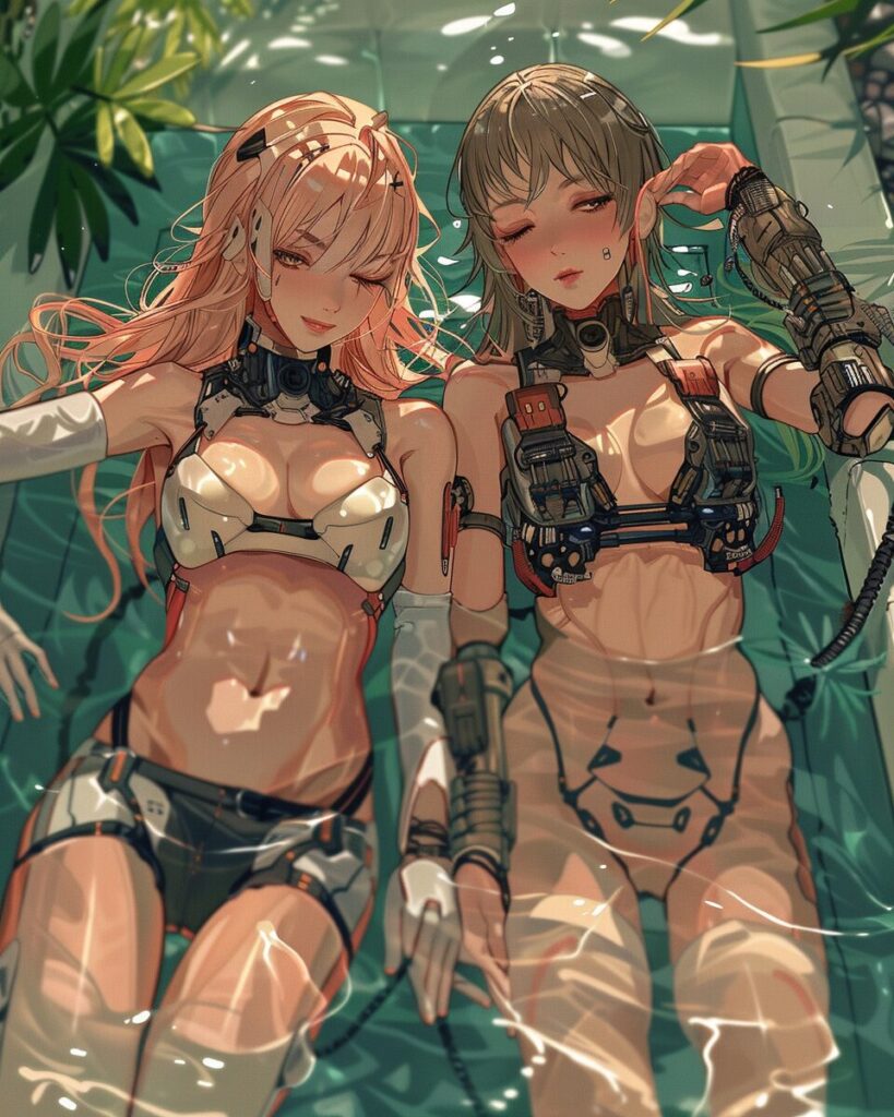 使用したプロンプトはこちら▼ <prompt> Masamune Shinrow artist style Cyberpunk woman, manga cyborg clean body, two beautiful young european female cyborgs lie in the pool and relax, one cyborg is blonde, the second is a cyborg brunette, a large number of cyberpunk parts, implants and mechanical parts in their bodies, precise details, androids, HD --ar 4:5 --style raw --stylize 200