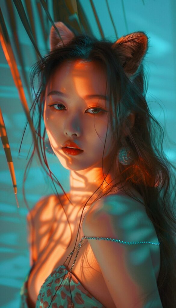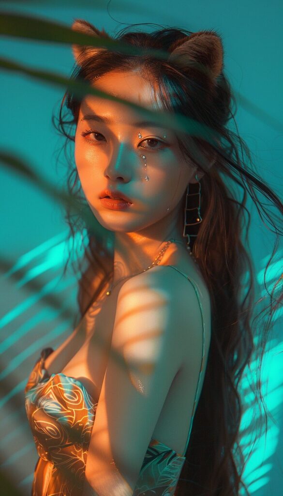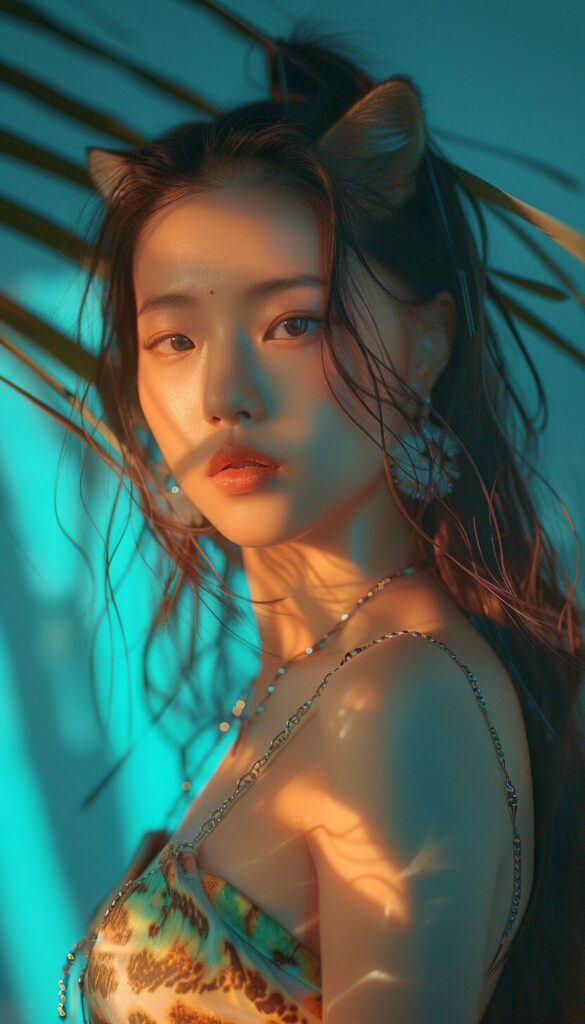使用したプロンプトはこちら▼ <prompt> chinese girl in a fox top wearing a long haired raccoon, in the style of light sky-blue and light cyan, poolcore, vacation dadcore, eye-catching tags, temmie chang, feminine body, light sky-blue and dark green --ar 57:100