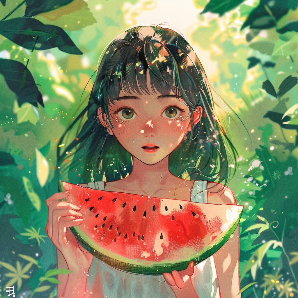 使用したプロンプトはこちら▼ <prompt> A girl is holding a watermelon while eating, and the weather is hot