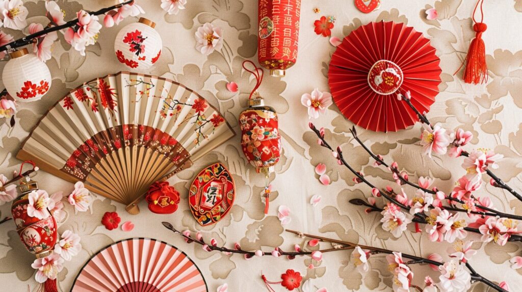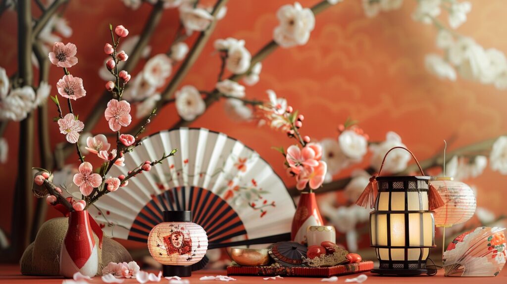 使用したプロンプトはこちら▼ <prompt> Generate a captivating image featuring symbols of Hinamatsuri, summer, such as plum blossoms and a fan, red-and-white diamond-shaped rice cakes, and lanterns, arranged on a flat surface. --ar 16:9