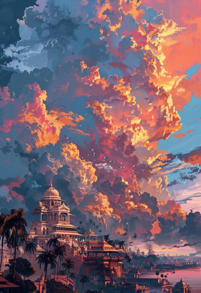 使用したプロンプトはこちら▼ <prompt> Jaffna city in Sri Lanka, unique perspective, never before seen, in the style of unique yokai illustrations, impressive skies, south indian, vibrant stage backdrops, ethereal cloudscapes, vibrant illustrations, bob ross, neo-traditional --ar 11:16
