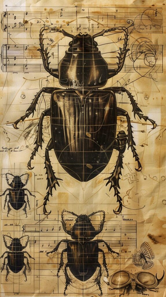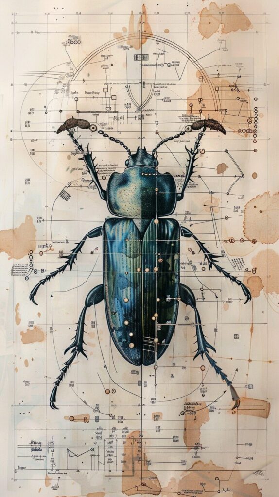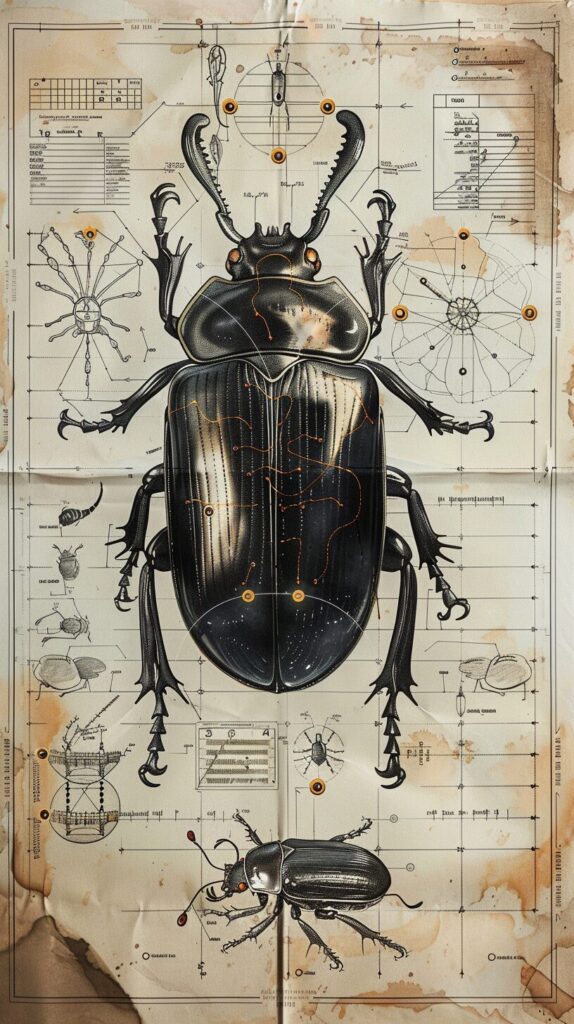 使用したプロンプトはこちら▼ <prompt> beautiful scientific illustration on paper of alien beetle evolution with notation --ar 9:16