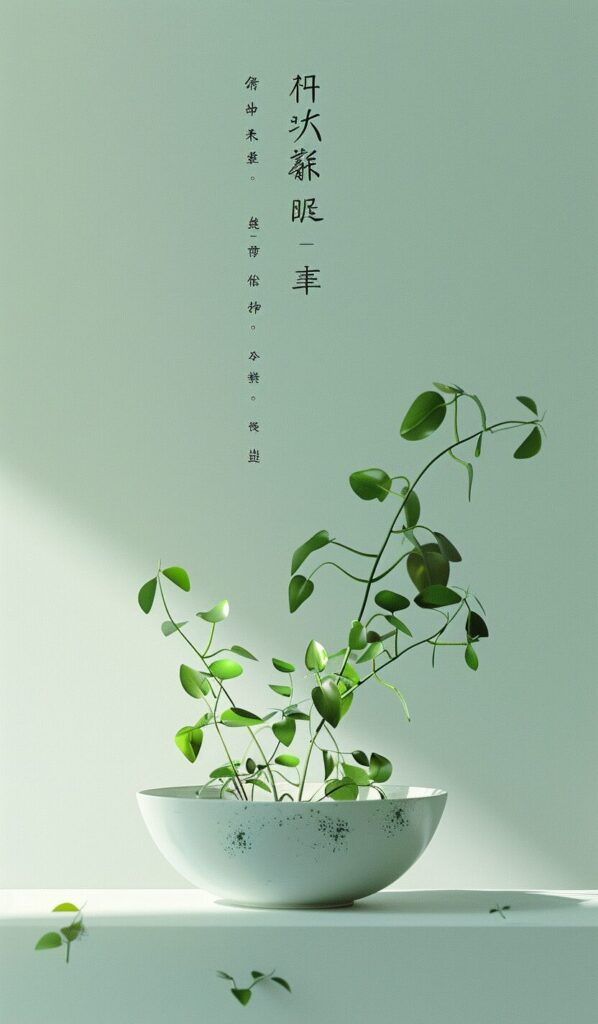使用したプロンプトはこちら▼ <prompt> chinese poster,the plant in the bowl with chinese writing, in the style of rendered in cinema4d, green academia, simple yet powerful forms, negative spaces, multilayered realism, meticulous design, passage --ar 10:17