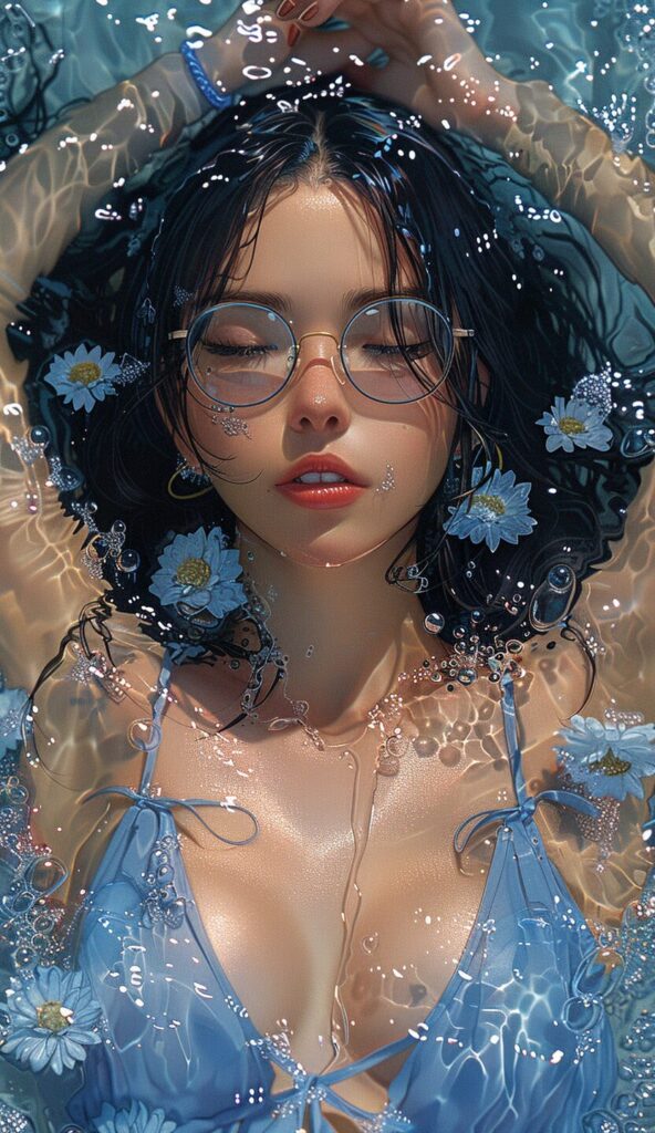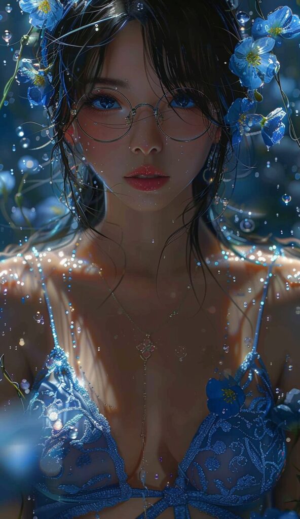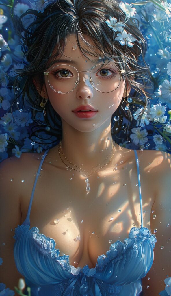 使用したプロンプトはこちら▼ <prompt> an anime girl in a blue dress with glasses, in the style of pointillist florals, 32k uhd, yanjun cheng, illustrative, genderless, sparkling water reflections, sunprint --ar 37:64 --style raw --stylize 750