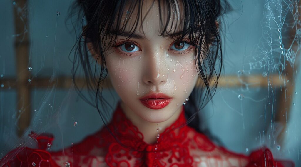 使用したプロンプトはこちら▼ <prompt> a girl in a red dress with a red lipstick, in the style of shige's visual aesthetic style, water drops, chinapunk, light white and dark cyan, shiny eyes, fairycore, photo-realistic --chaos 20 --ar 128:71 --style raw --stylize 600