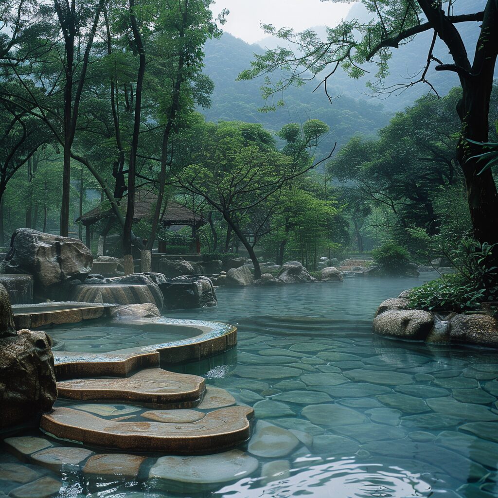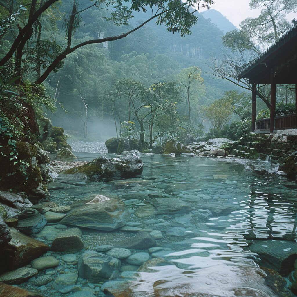 使用したプロンプトはこちら▼ <prompt> Jiangxi Tongling Jiubao Hot spring, a land of spiritual springs surrounded by mountains. The stream whispers, the bamboo shakes gently, and the steaming heat dances in the morning mist. The hot spring pool is like a jewel set in the valley, clear to the bottom, with a touch of blue green. Bathe in this, as if you can hear the breath of the earth, feel the gentle comfort of nature. The surrounding mountains stand solemn and quiet like a patron saint, covering this land with a mysterious and peaceful veil. Comic art --stylize 250