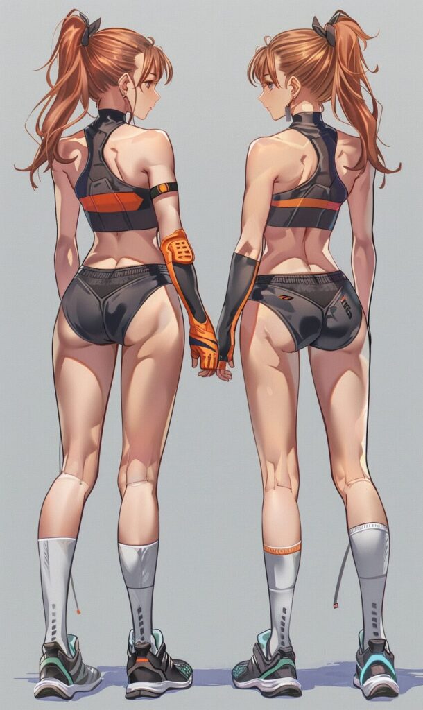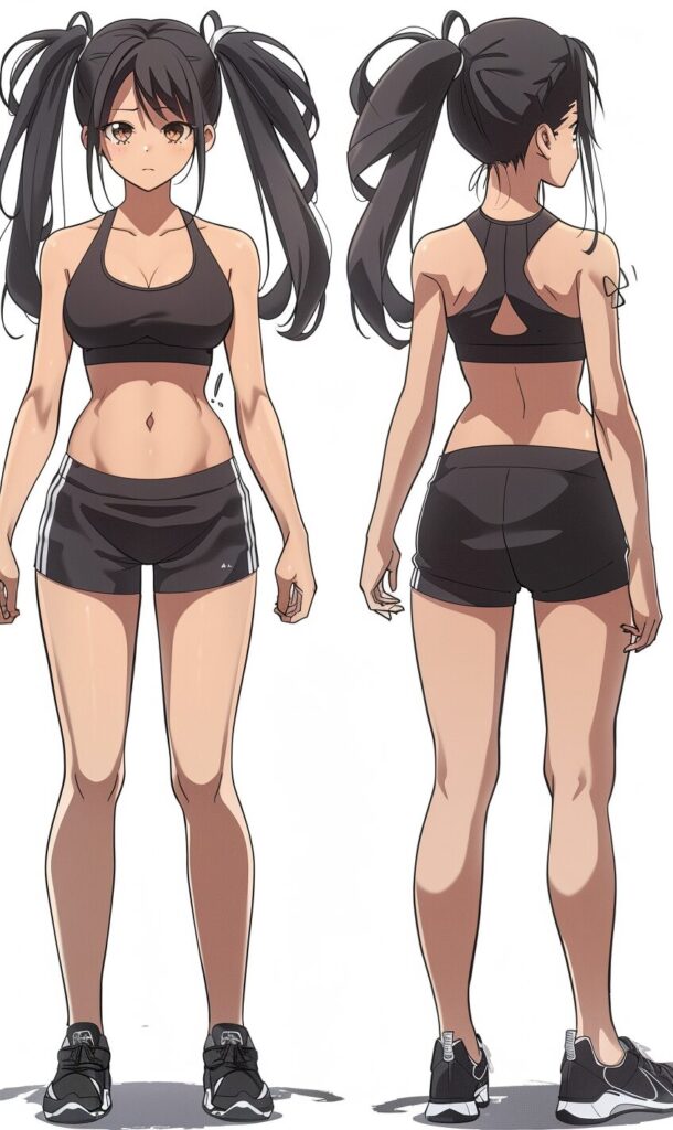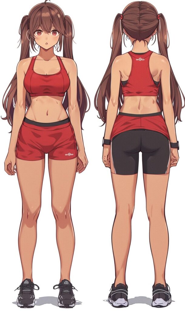 使用したプロンプトはこちら▼ <prompt> The setting picture of a vigorous girl, with front and back views, wearing sportswear, and anime animation style --ar 3:5 --v 6.0
