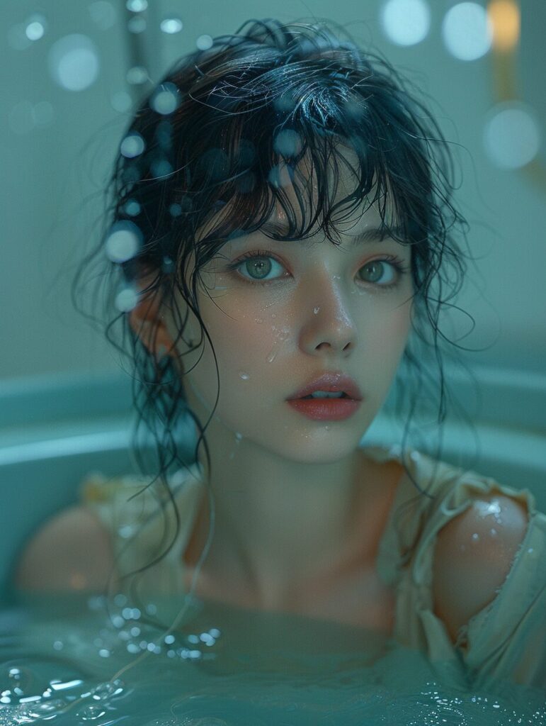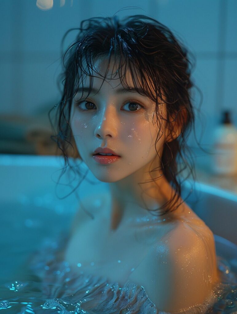 使用したプロンプトはこちら▼ <prompt> A Japanese beauty in the bathtub in the bathroom, cute, humid environment, cyberpunk tones, half-body close-up, realistic photography, ultra-detailed, beautiful light masterpiece --ar 3:4 --stylize 750