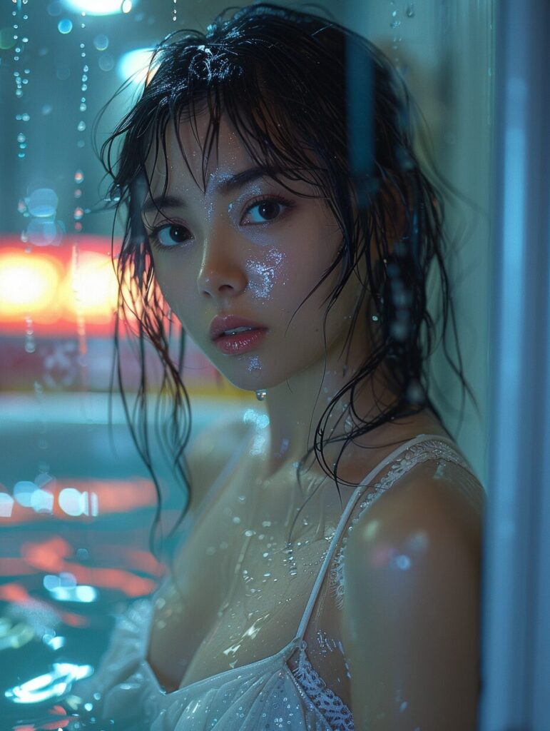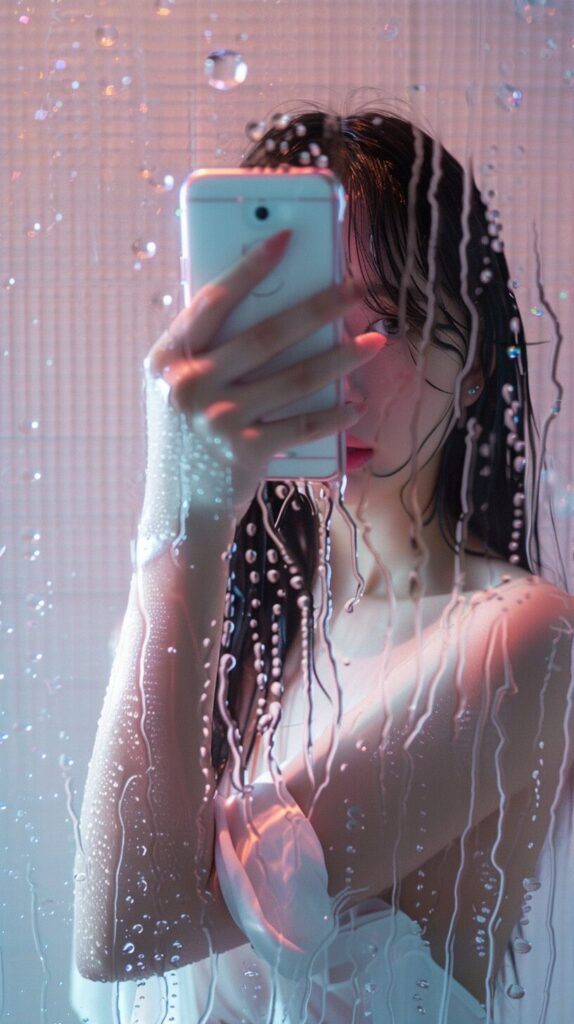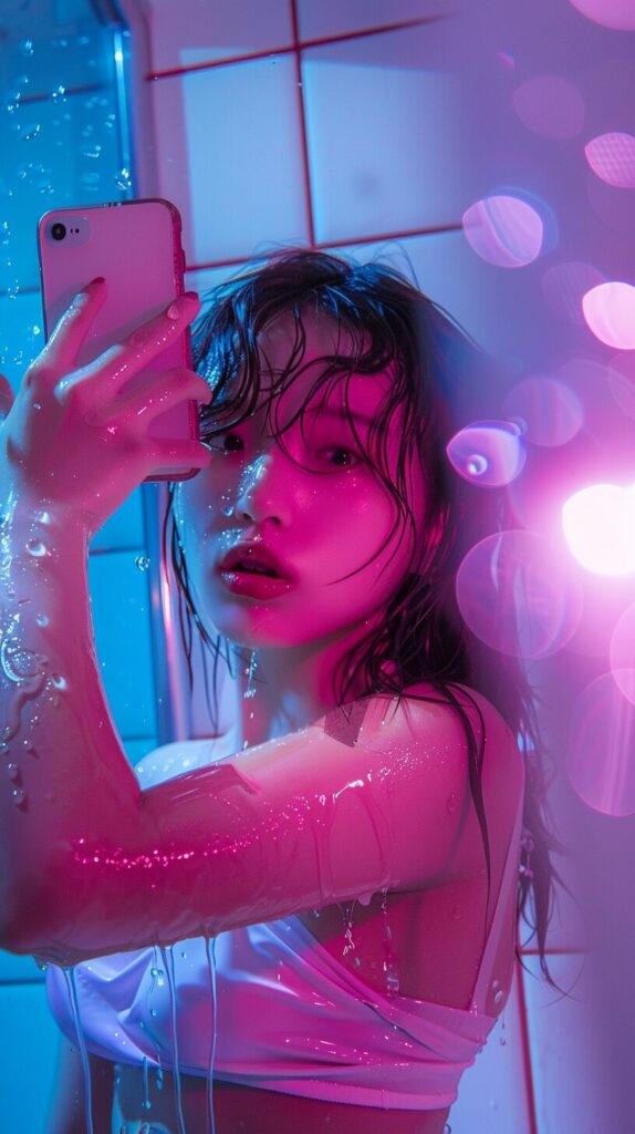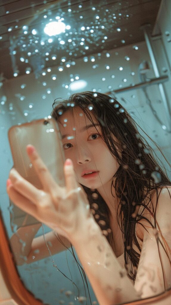 使用したプロンプトはこちら▼ <prompt> Chinese girl, taking selfies in the bathroom, wet hair, water droplets, phone, mirror, pink white, bright, atmospheric, lighting, Herm è s, swimming pool, full body, high-definition, lens halo,,in clothes --ar 9:16 --stylize 30