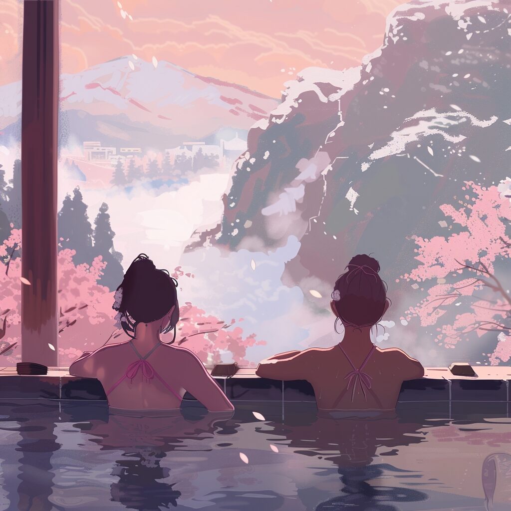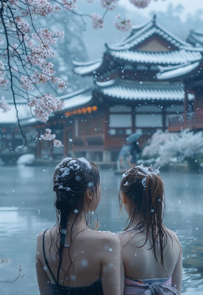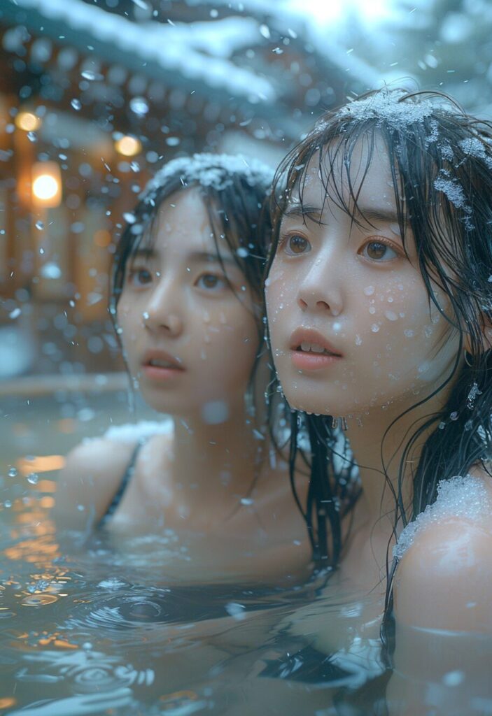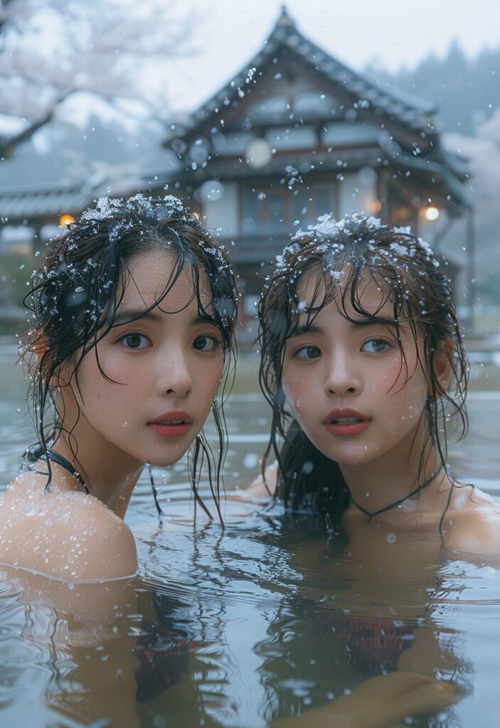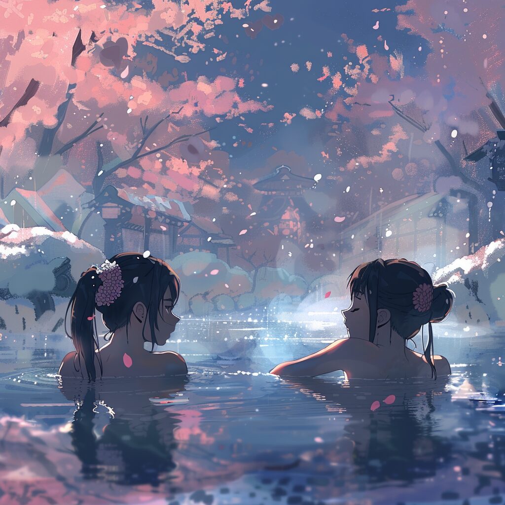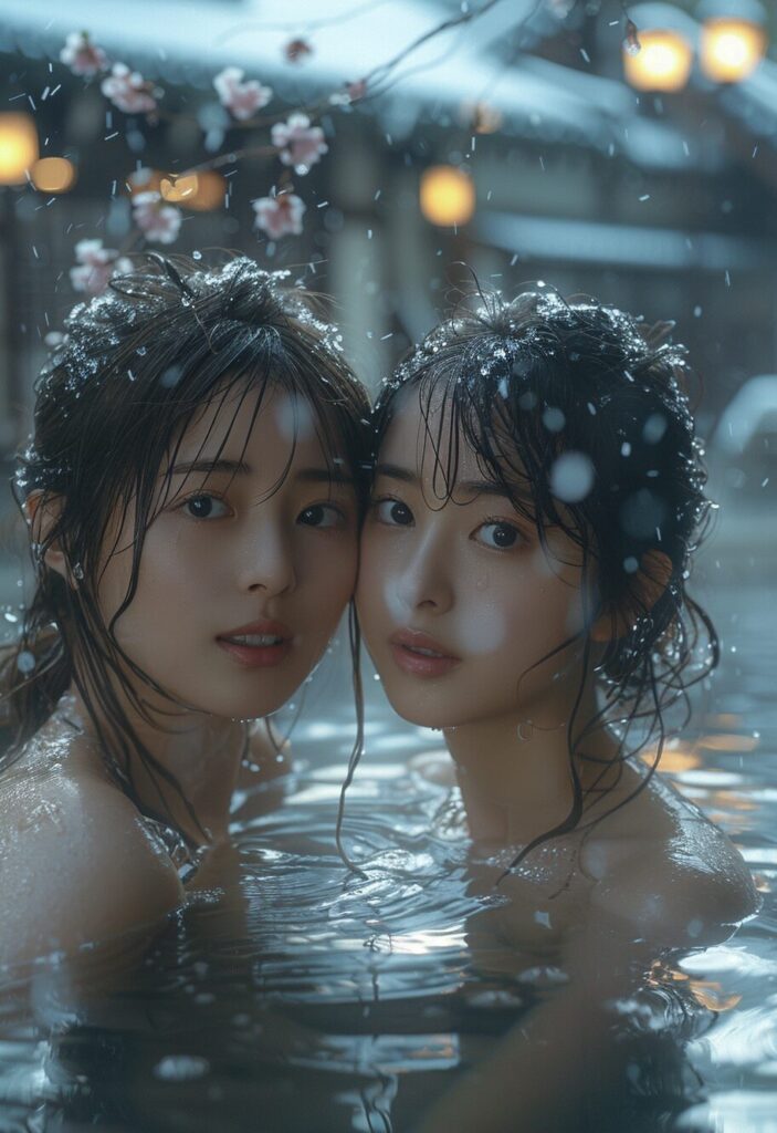 使用したプロンプトはこちら▼ <prompt> two japanese girls are lounging in an onsen. steam rises from the water and we can see snow on the cherry blossom trees behind them