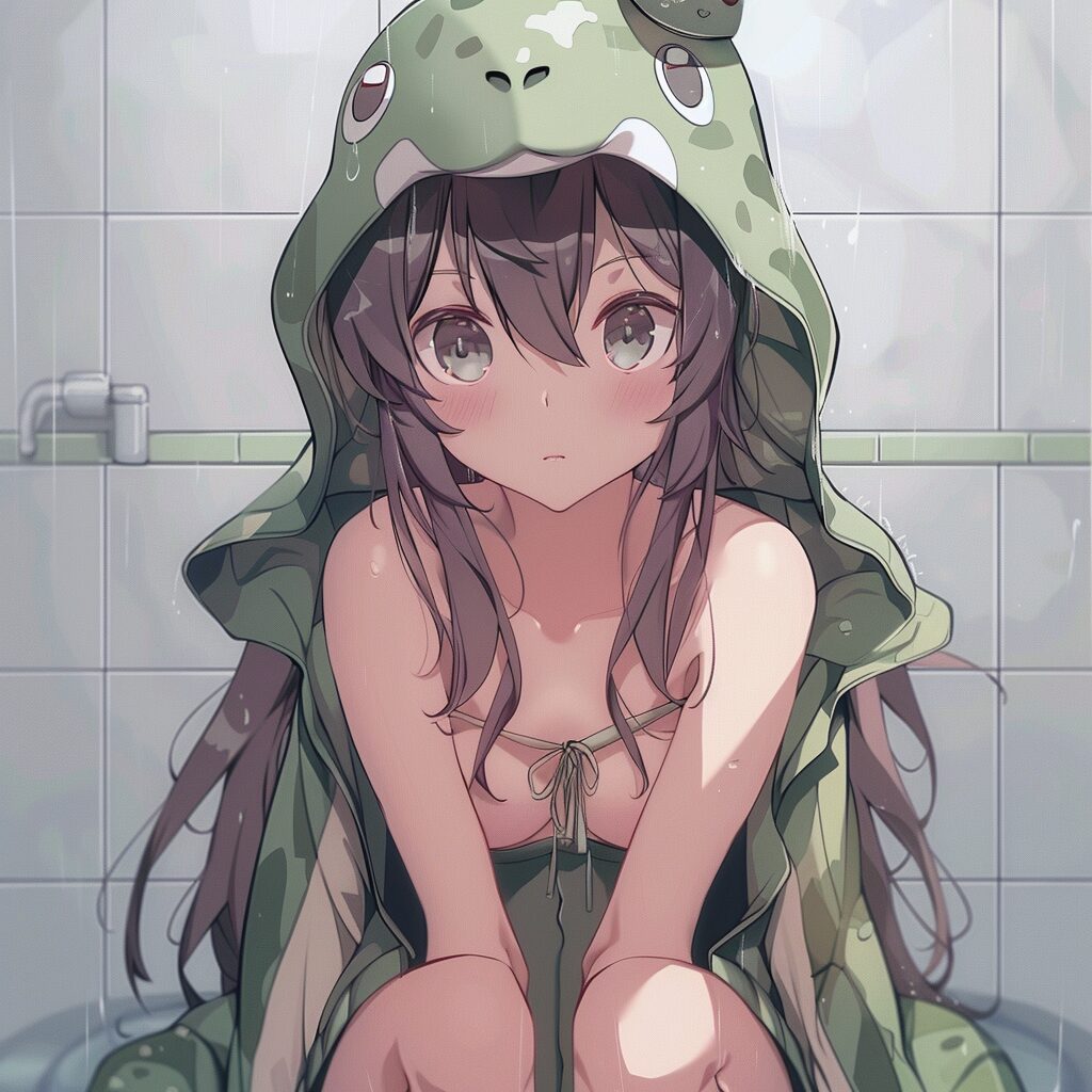 使用したプロンプトはこちら▼ <prompt> a cute girl with long brown hair and gray eyes wears a turtle outfit, anime --style raw