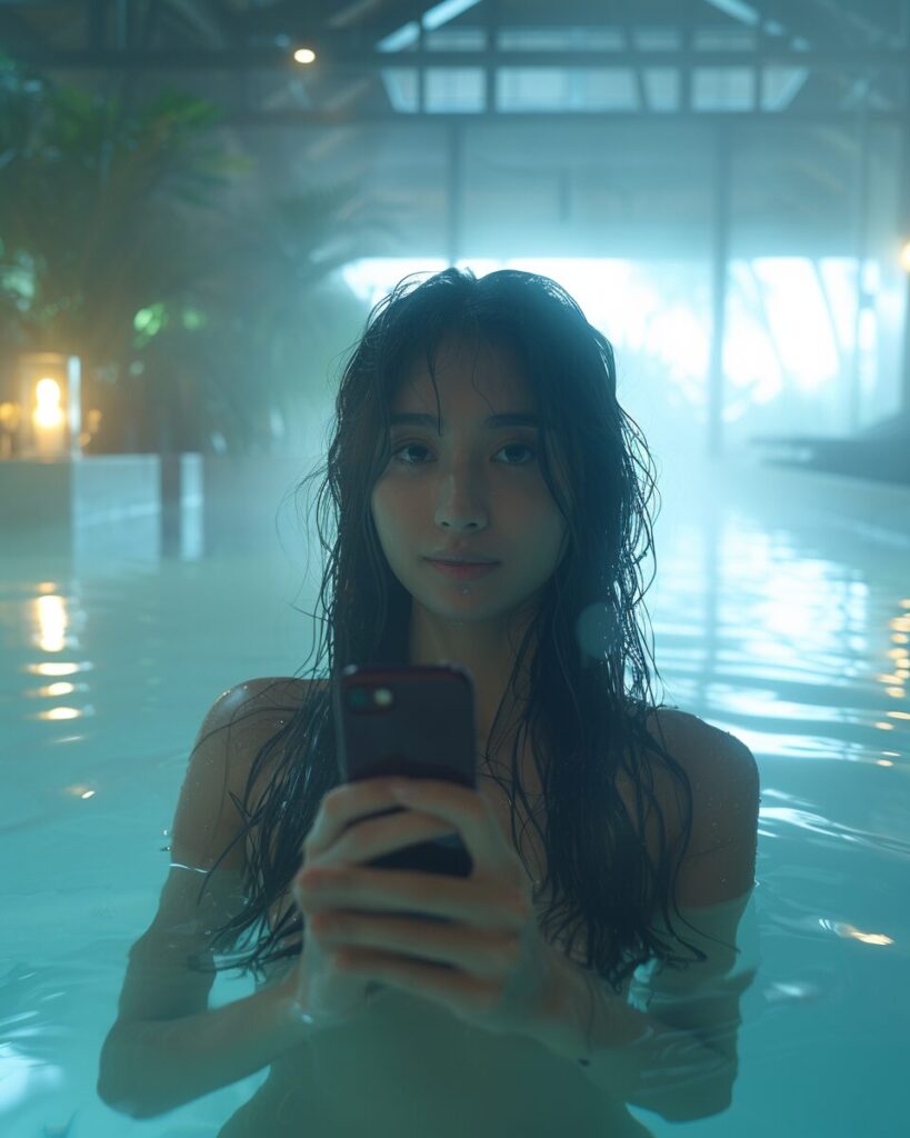 使用したプロンプトはこちら▼ <prompt> Shot with iphone15, frontal shot, [a japonese girl taking a selfie in the water, long black hair], modern hot spring hotel, in the room, fog, bathtub, night, brick wall, cement, stone, simple design , white and dark gray. --ar 4:5 --style raw --stylize 750 --v 6.0