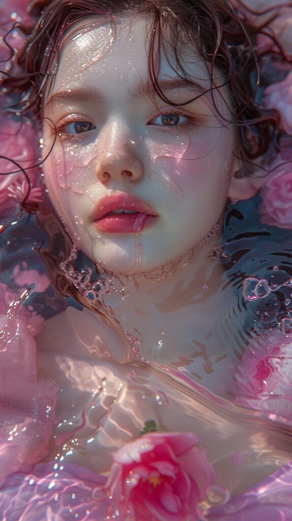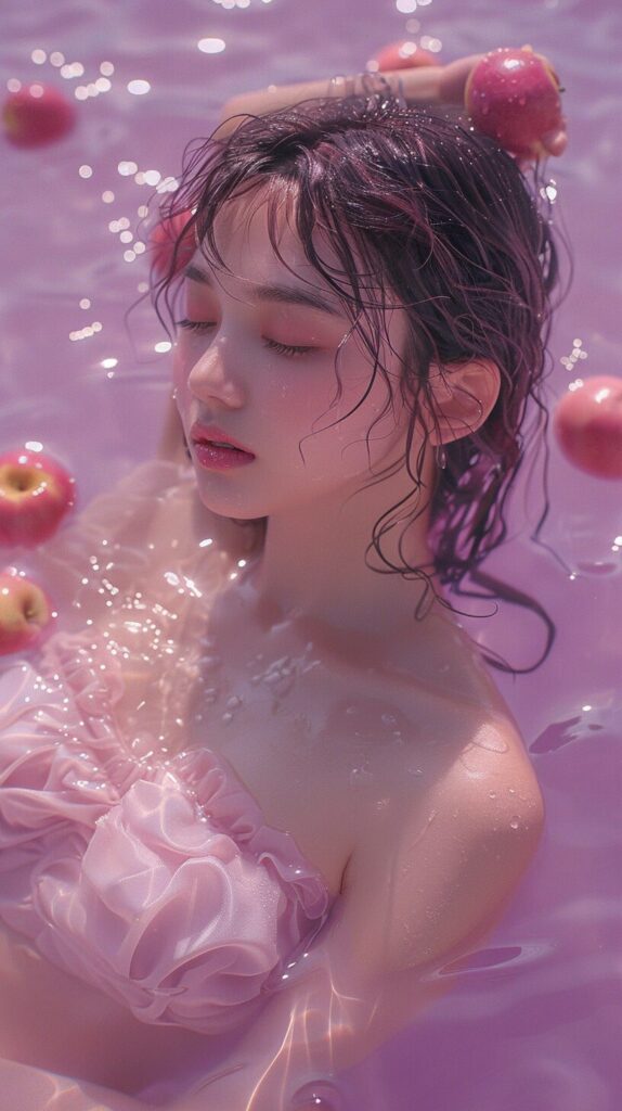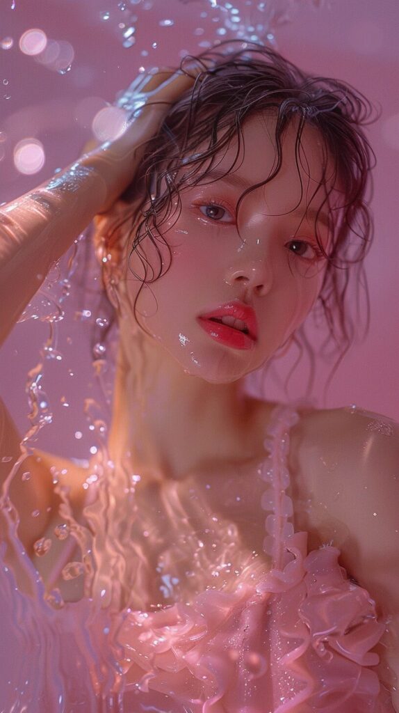 使用したプロンプトはこちら▼ <prompt> portrait woman, full body, apple wallpaper pink 775 hd, in the style of ren hang, hyper-realistic water, anime aesthetic, photorealistic scenes, resin, light violet, larme kei --ar 9:16 --stylize 250