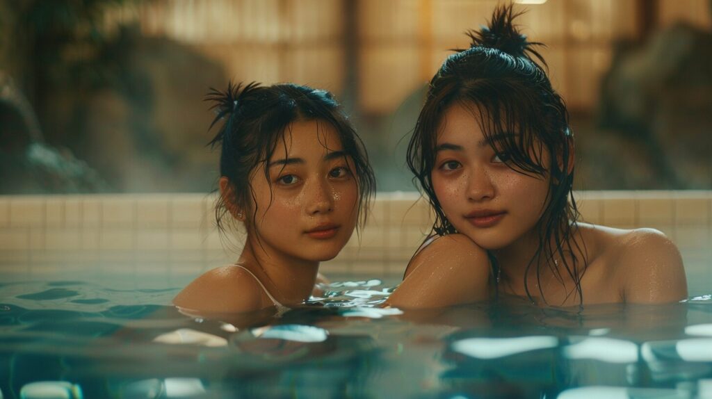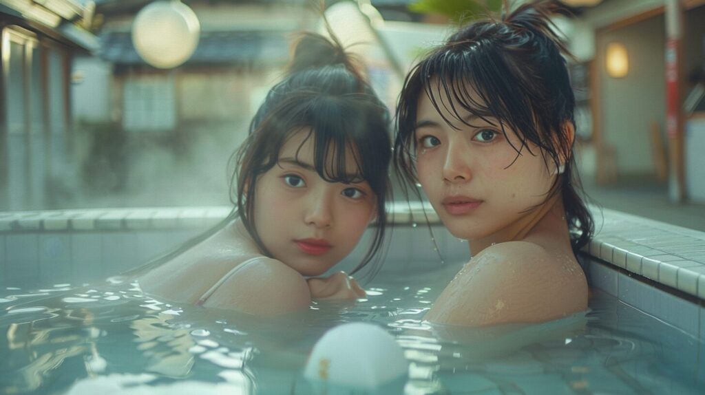 使用したプロンプトはこちら▼ <prompt> Used,Secondhand,Pre-owned,Previously owned,Refurbished,Stereotypical picture quality, two young Japanese women, Enjoying the hot spring, looking at us, with enraptured eyes, as if enjoying a double date, in the city,16:9 photographic style --ar 16:9